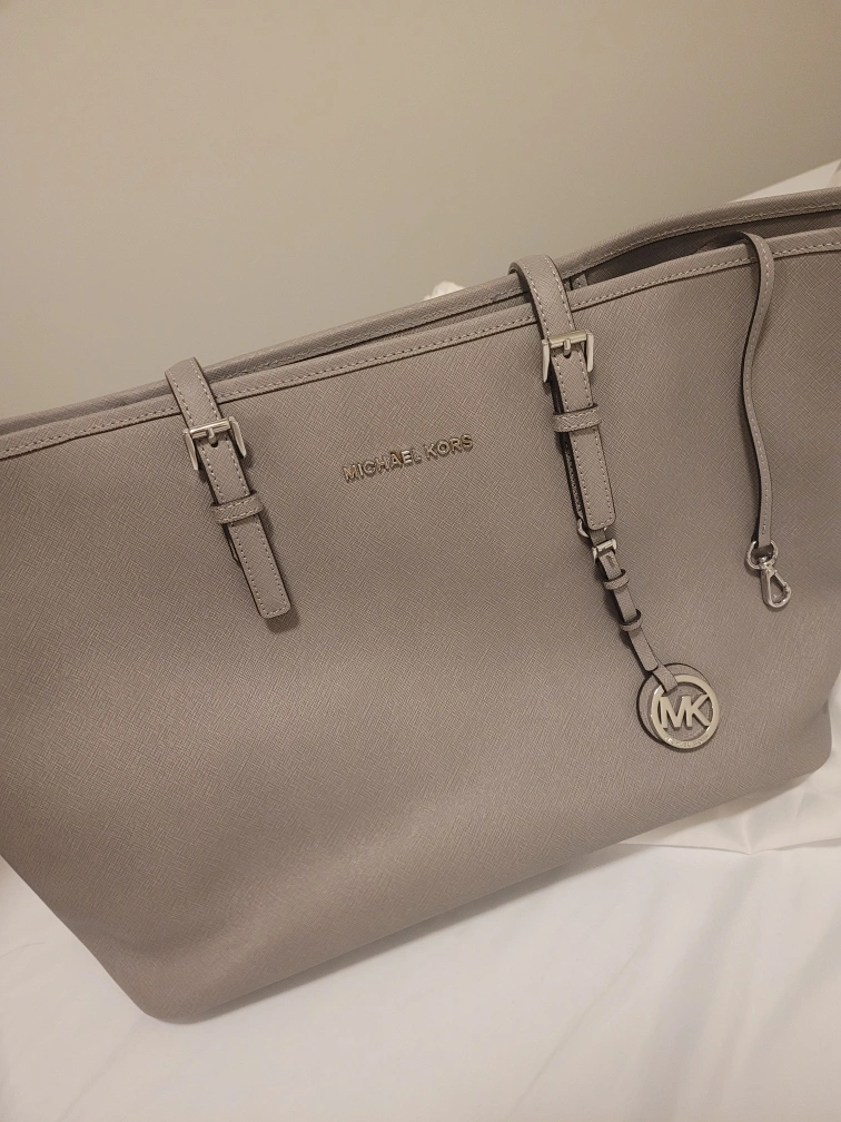 Large grey tote bag with double handles, silver hardware, and a detachable MK charm. Has multiple pockets and a zipper closure. Comes with a dust bag.