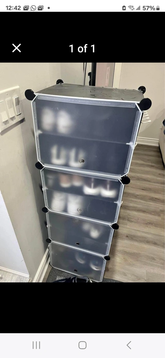 38Black plastic shoe rack with clear shelves. Holds lots of shoes.