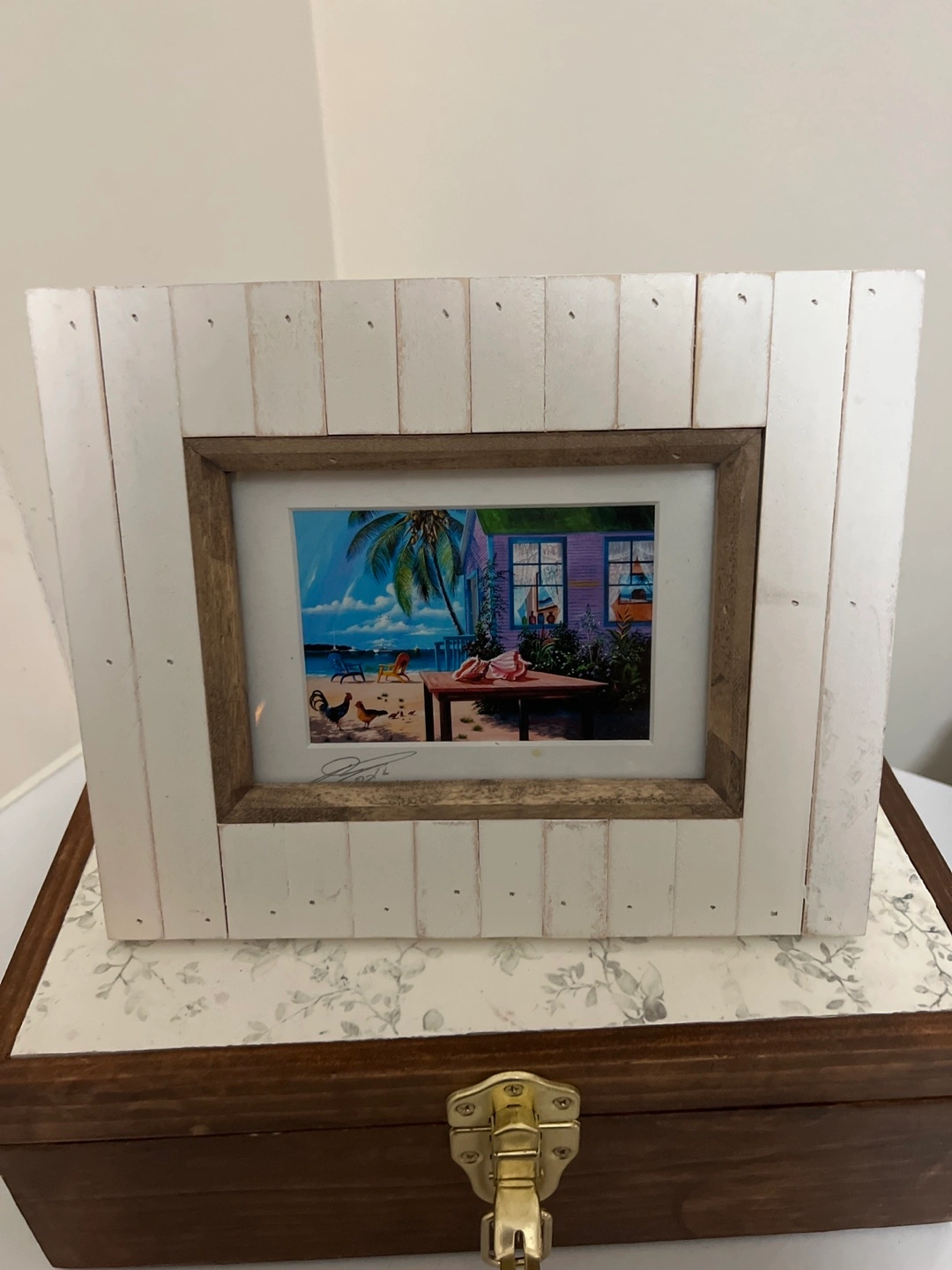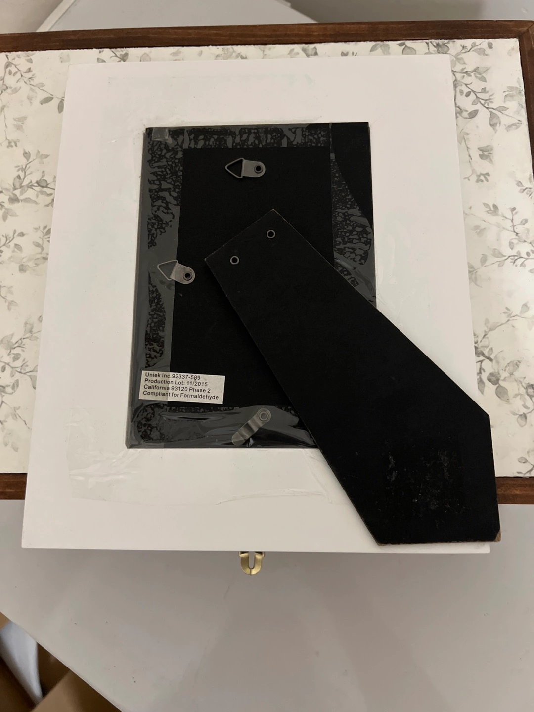 143Small white picture frame with a brown wooden trim. Features a kickstand for display. Includes a glass front to protect the picture. New but don’t need it.