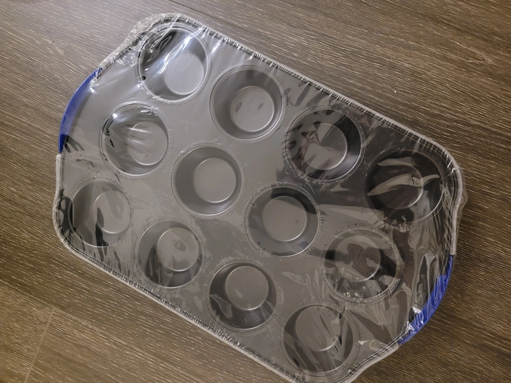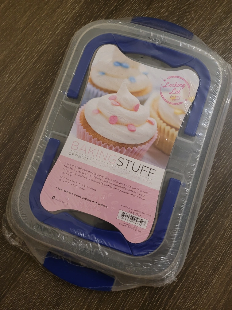 Non-stick cupcake pan with lid. Great for making cupcakes and muffins easily. Makes delicious treats to eat at family events or picnics. Measures 40.5 cm x 28 cm x 5 cm deep.