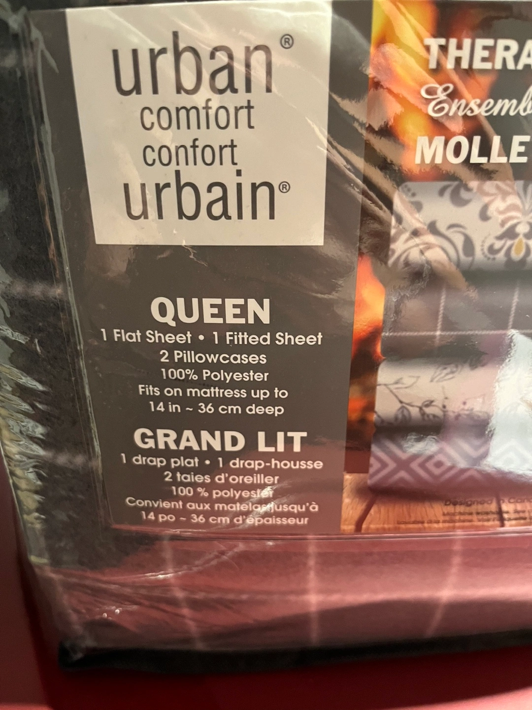 Queen size sheet set. Includes 1 flat sheet, 1 fitted sheet, 2 pillowcases, and 1 fitted sheet. Made of 100% polyester.