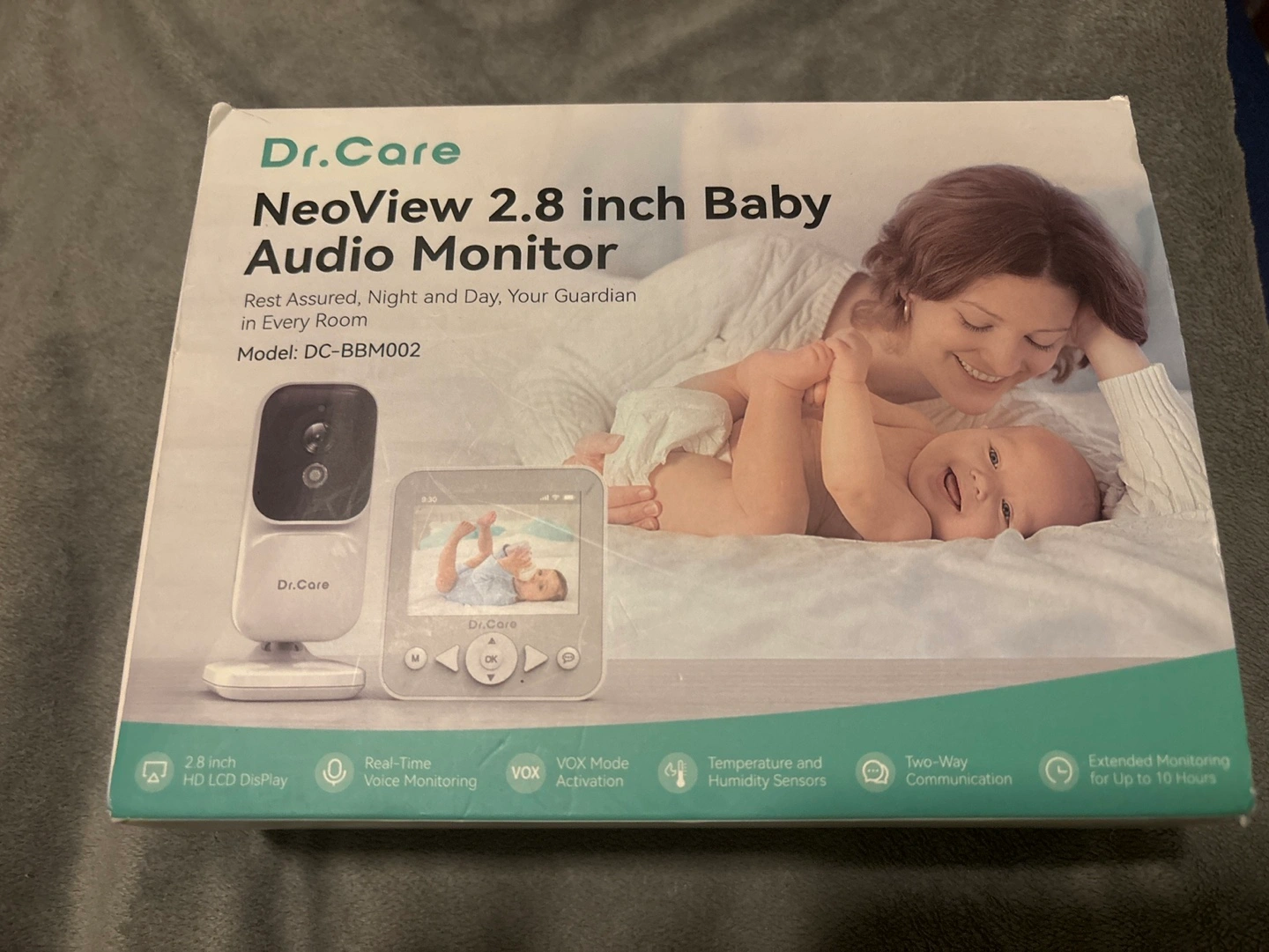 Baby monitor with 2.8 inch screen, two-way communication and extended monitoring for up to 10 hours.