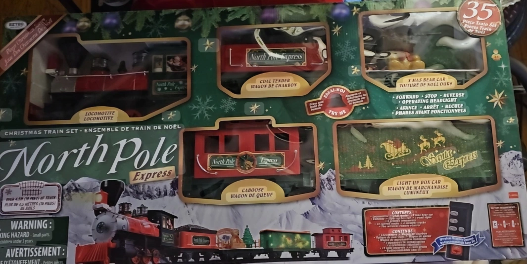 254Christmas train set, includes locomotive, coal tender, caboose, and light up box car. Features a remote control, forward, reverse, and operating headlight. Plays Christmas music. Pick up at Yonge & Steeles