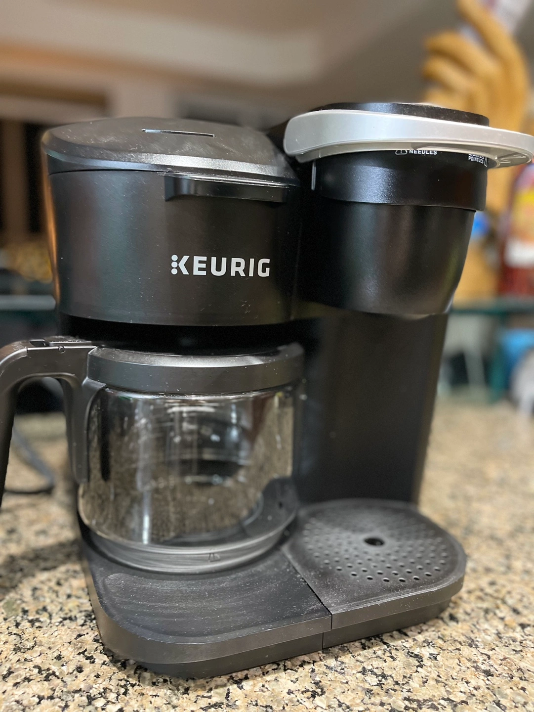 Single serve and carafe coffee maker. Uses ground coffee or K-Cups. Makes multiple brew sizes. 60 oz reservoir. Includes 12-cup glass carafe. Pause and pour feature.