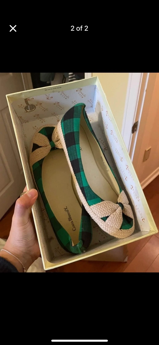 These are a pair of women's flats with a green and black checkered pattern, a tan coloured toe, and a bow at the toe. They are in the original box.
