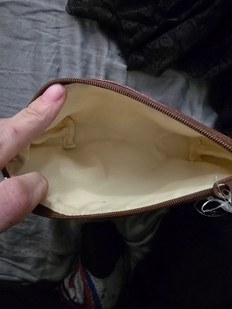 Yellow and brown zippered pouch with a Pompompurin design. Features a zipper closure. Sanrio. discontinued collectable. brand new.