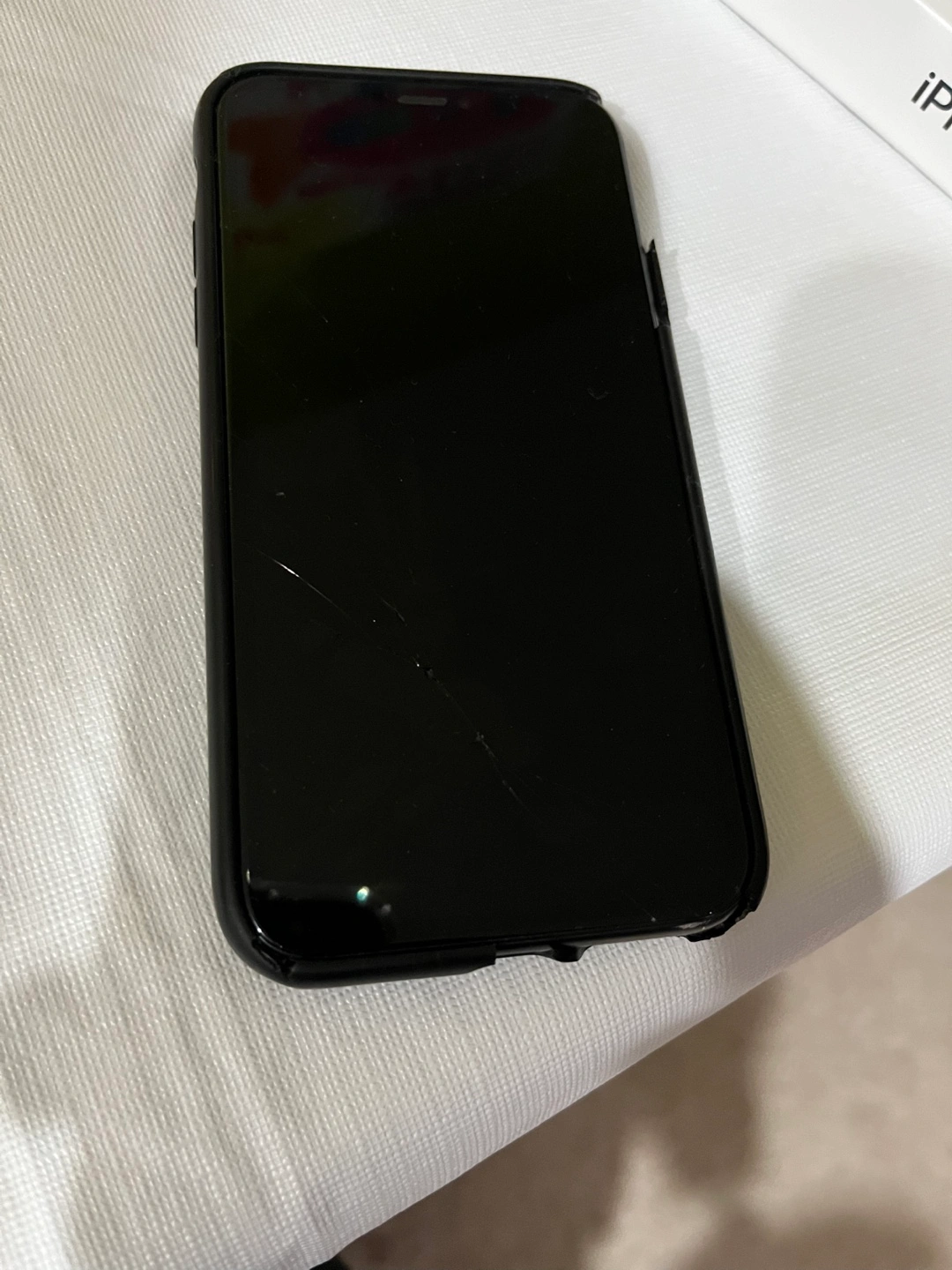 Cracked screen, as a result the black marks are on the screen. Screen still does work and is functional. Battery health is at 79%