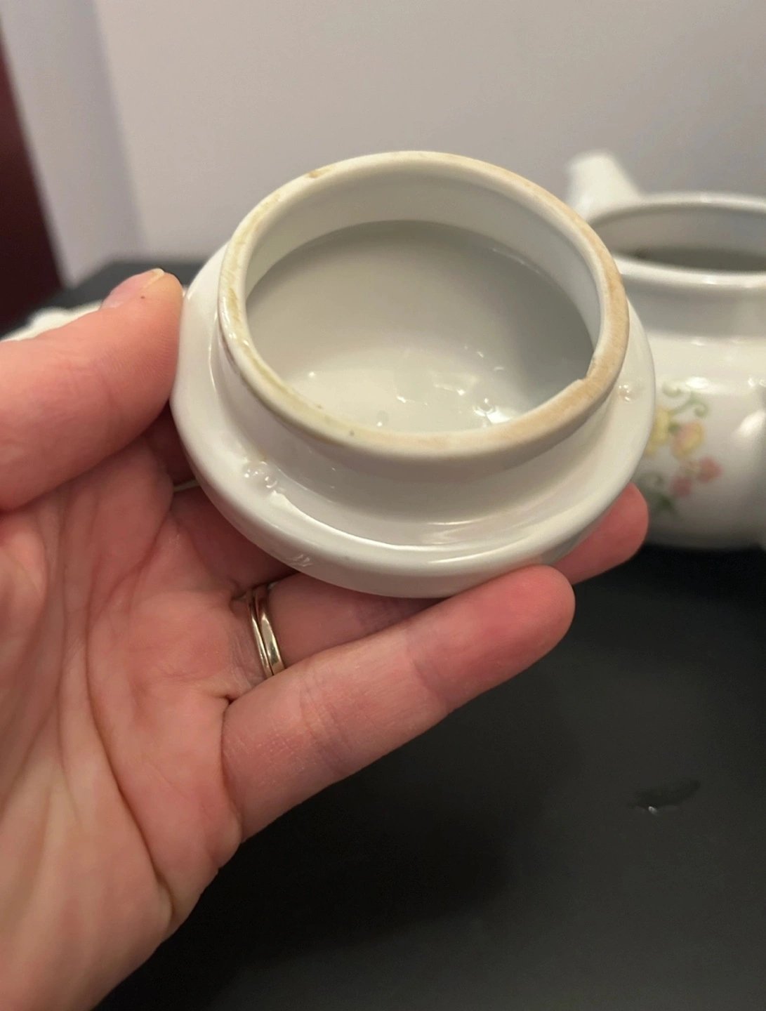 Cute tea for one set in fine China from Japan. Built-in strainer for loose tea if you want. With its cup and a lid. Pick up in the Beaches at Queen and Victoria Park.