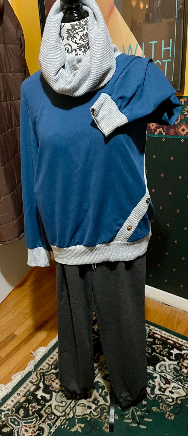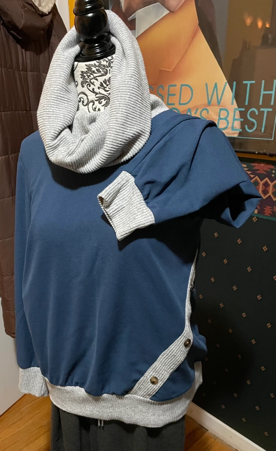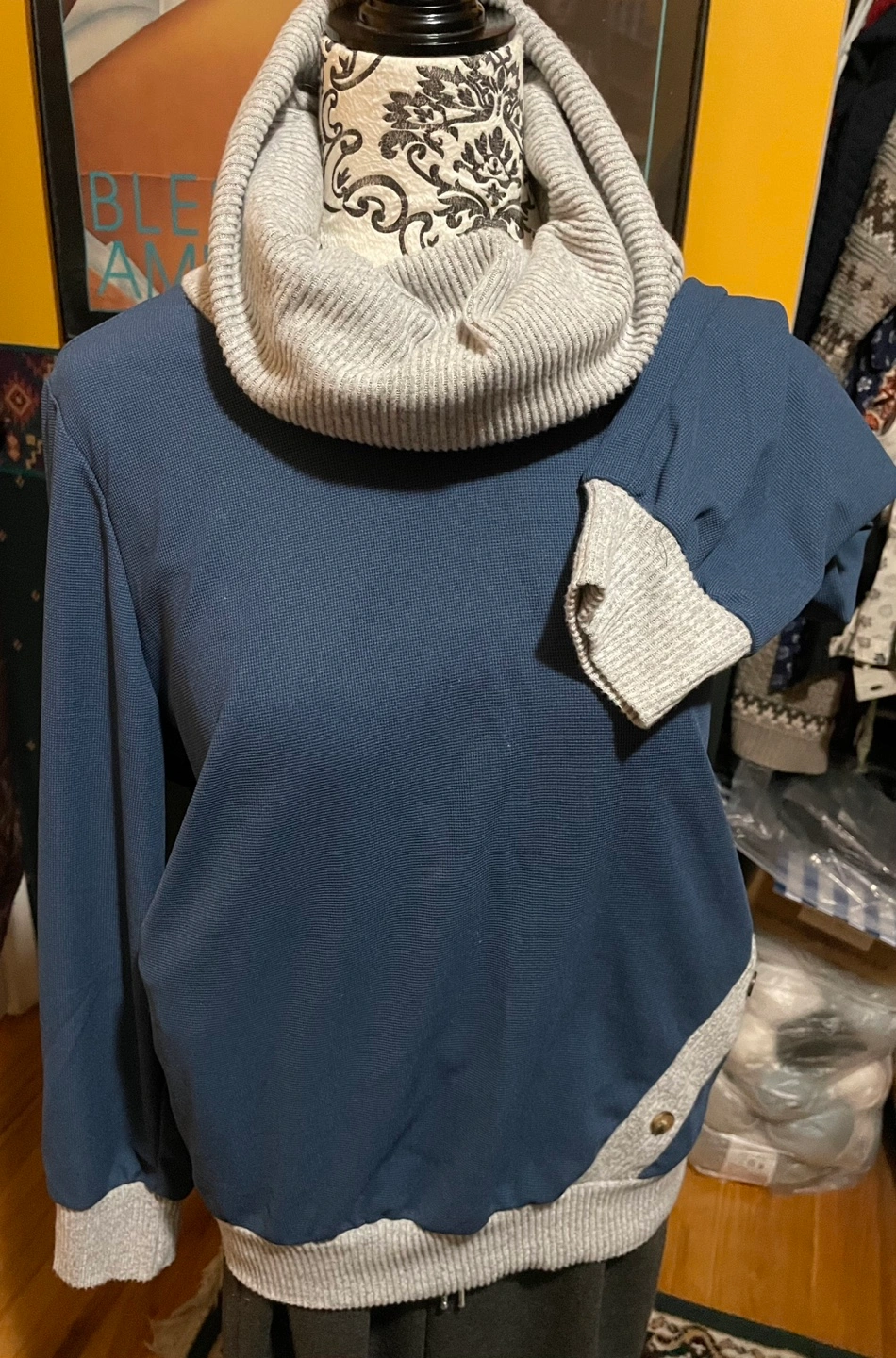 #ThriftyPicks Colour Blocked Long sleeve sweater with cowl neck and grey detailing. Has button accents on the side. Price Slayer Category Pick up (only) Victoria park ave north Lawrence Side street Clintwood Gate