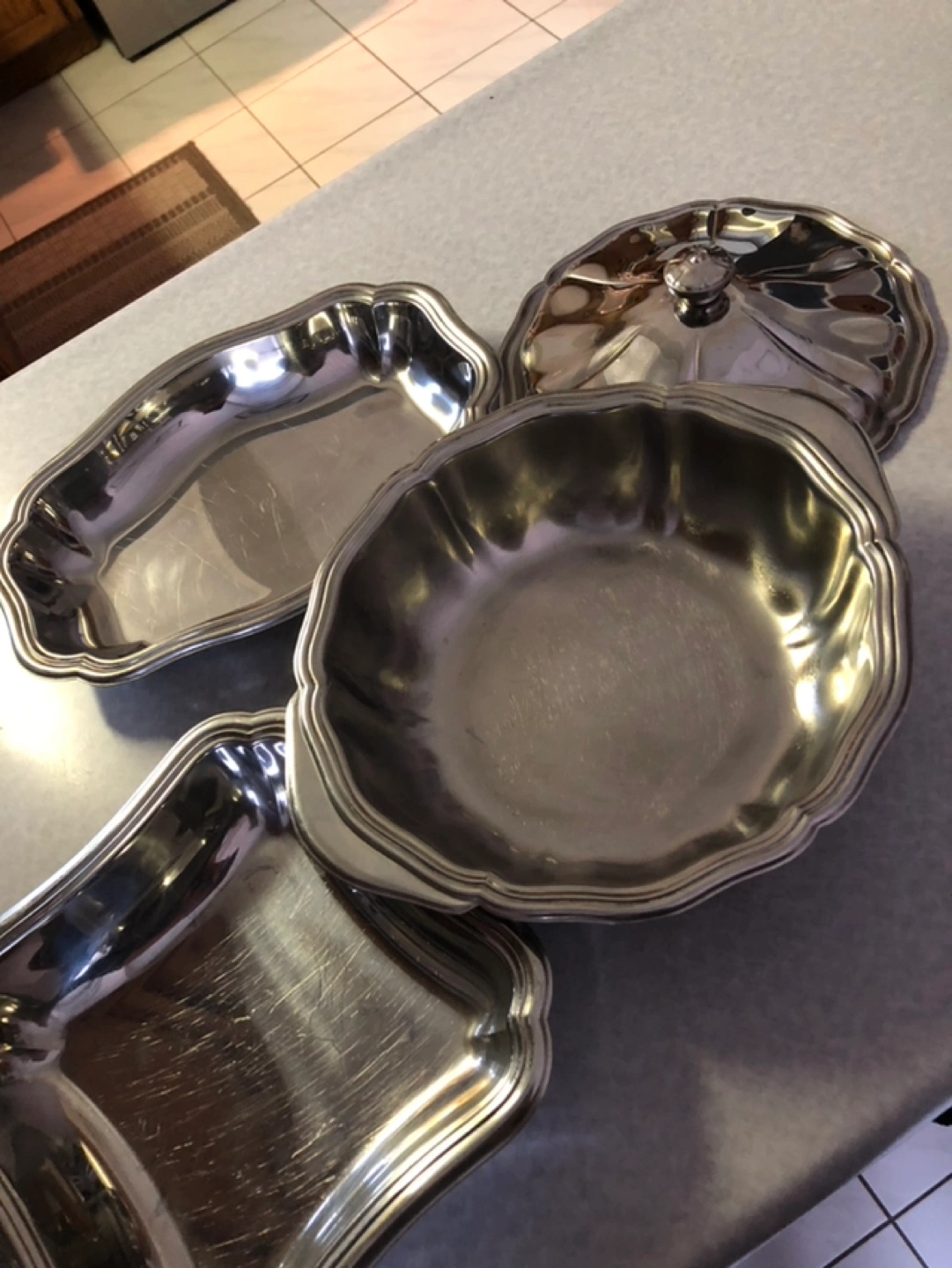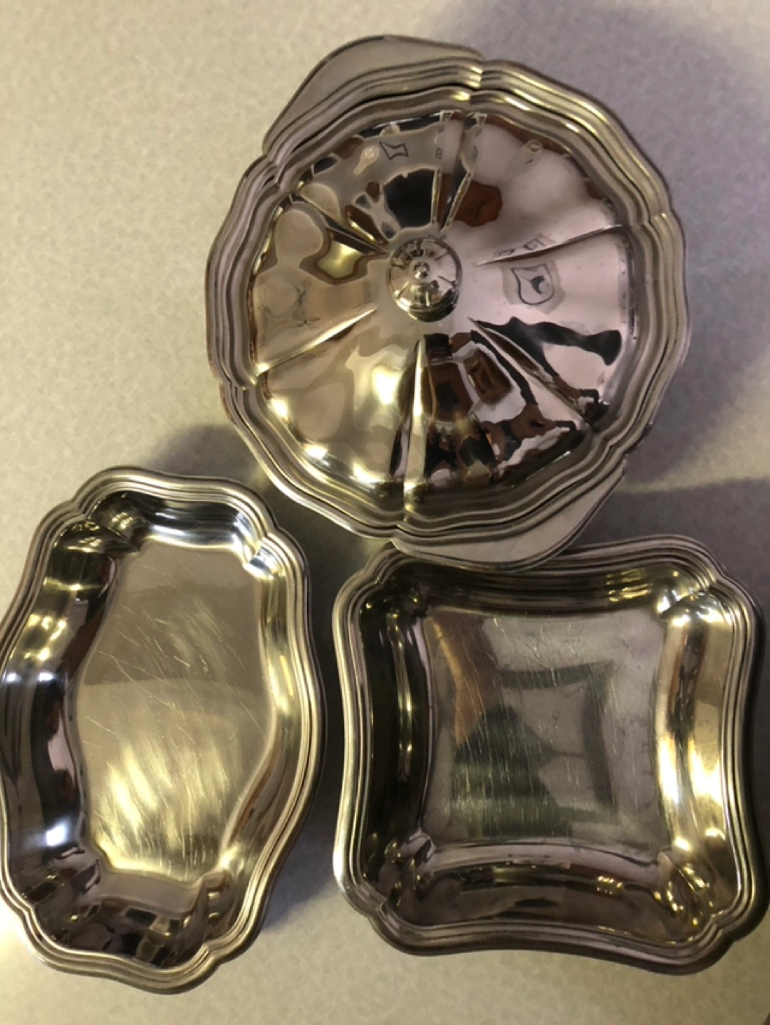 Set of three stainless steel serving dishes. Includes a large round dish with a lid, a smaller rectangular dish, and a square dish.