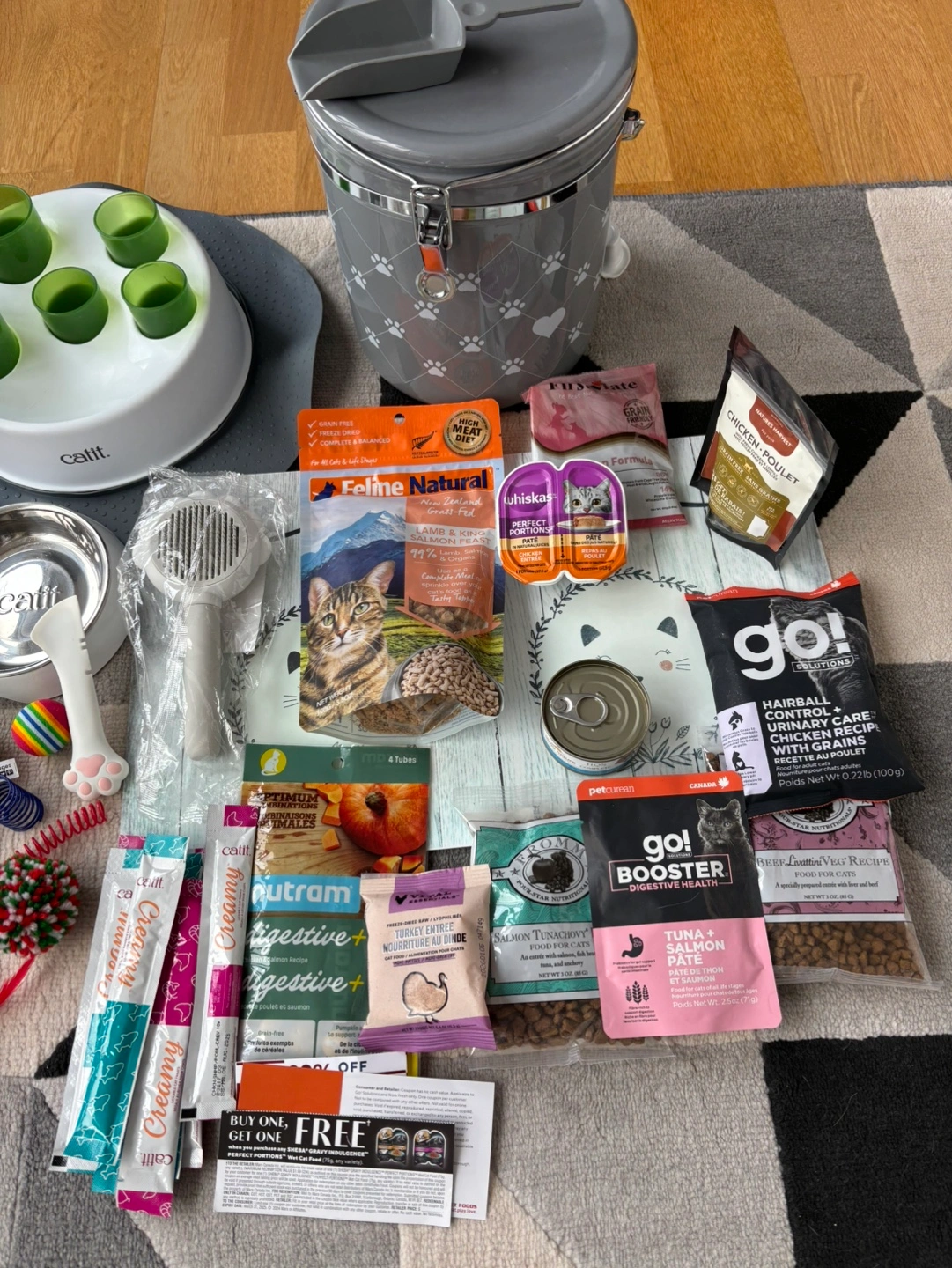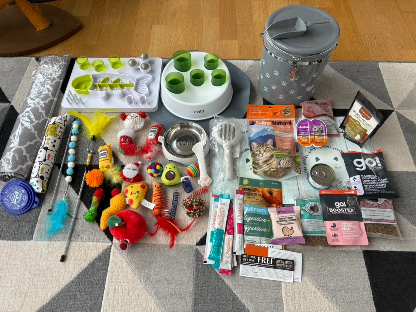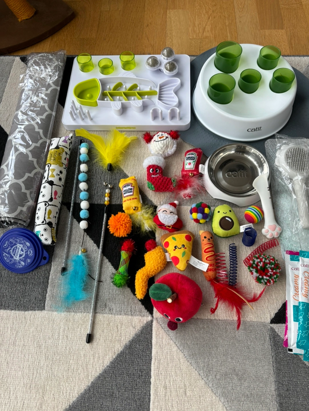 Here is a huge lot of various cat toys, food, treats, cat wands, 2 slow feeder, feeding mats, food container, brush and Catit products etc. All in mint to excellent condition!