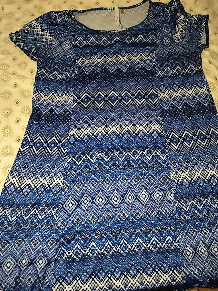 Blue and white geometric pattern dress, short sleeves, round neckline.