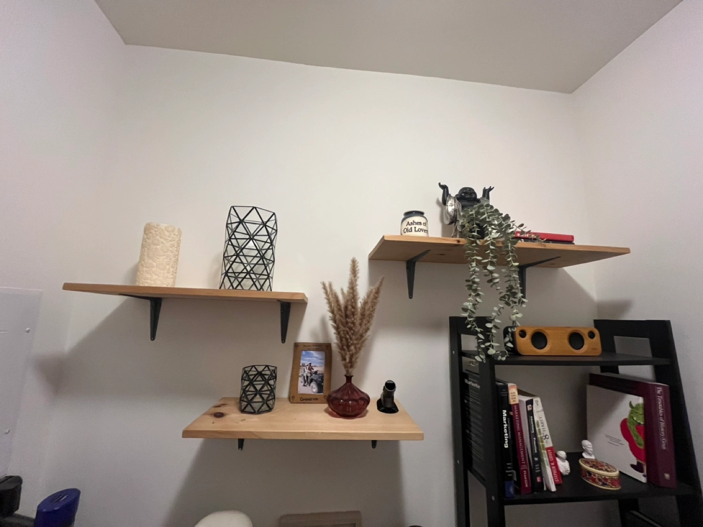1000+Set of 3 floating shelves, light wood with grey metal brackets.