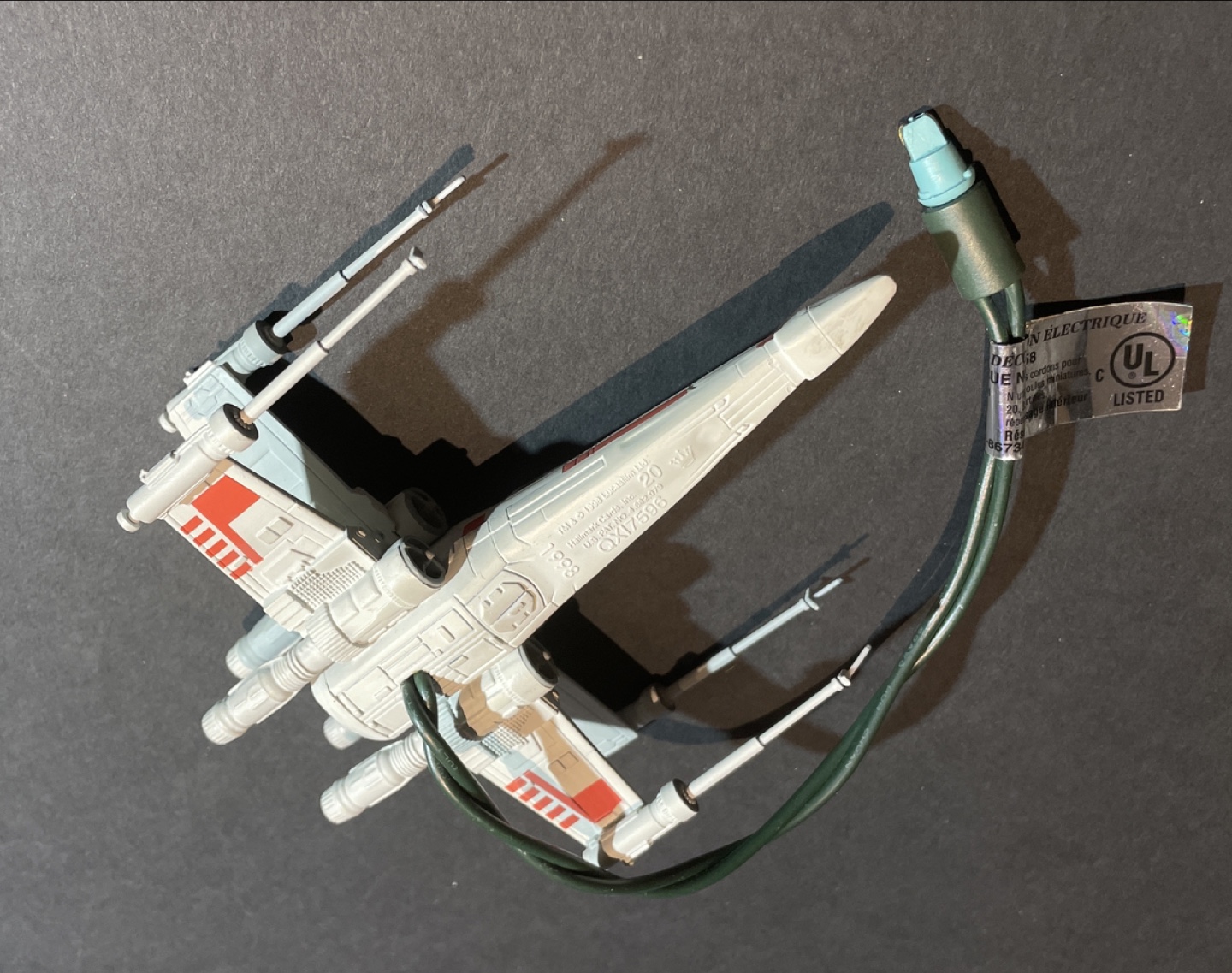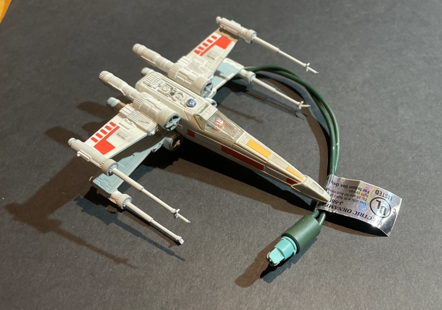 Hallmark X-Wing ornament with a light inside. Includes cord and plug for older light strings.
