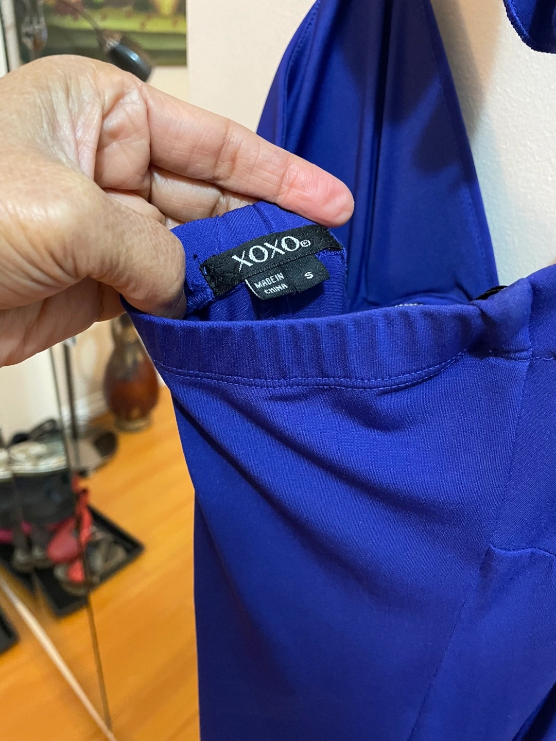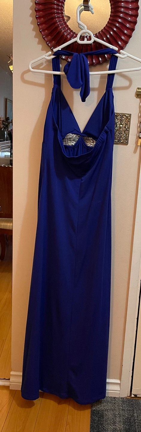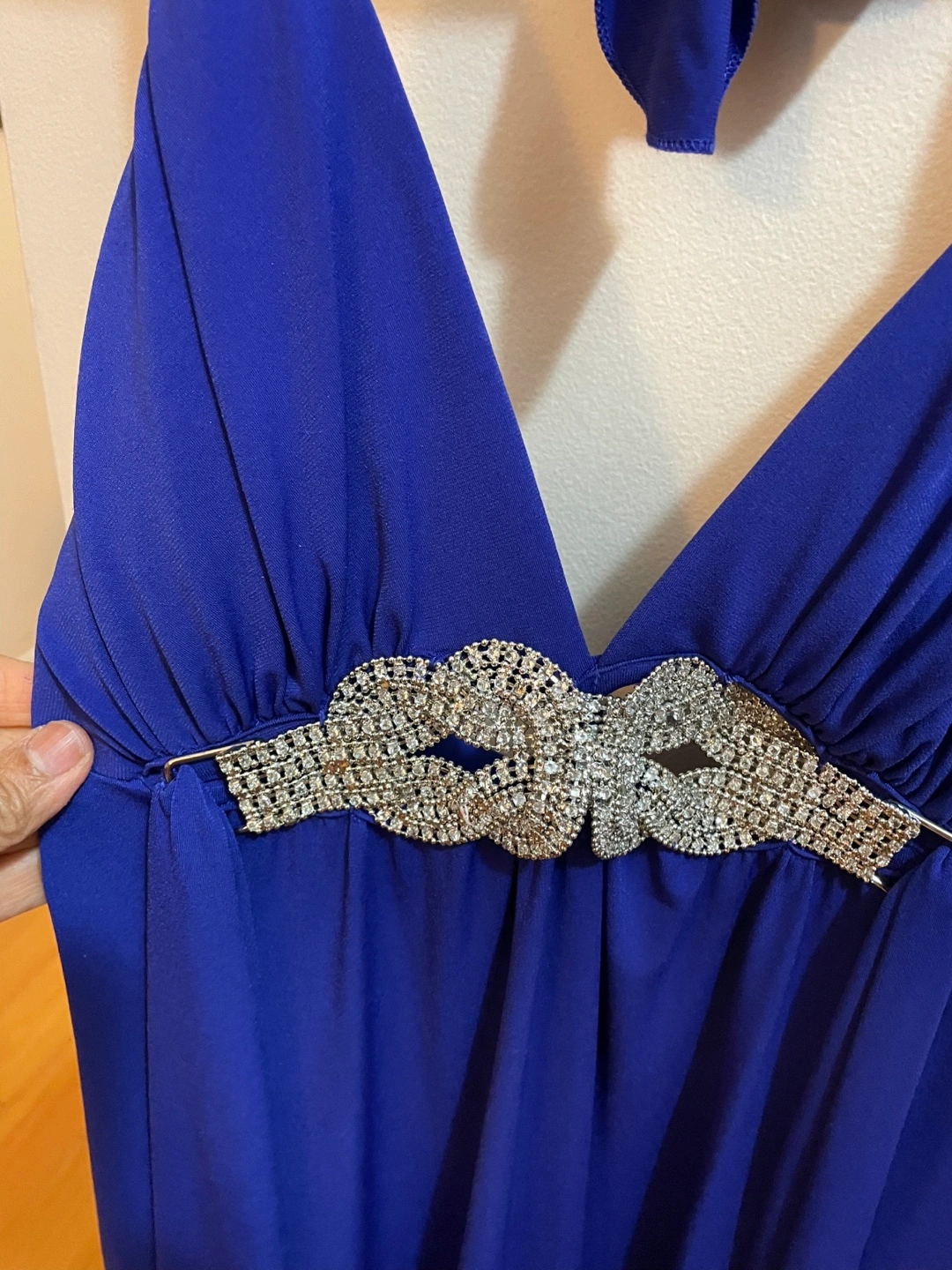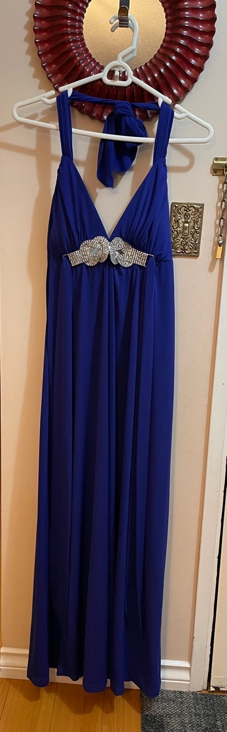 Blue halter maxi dress with a rhinestone embellishment. Has a tie at the neck.