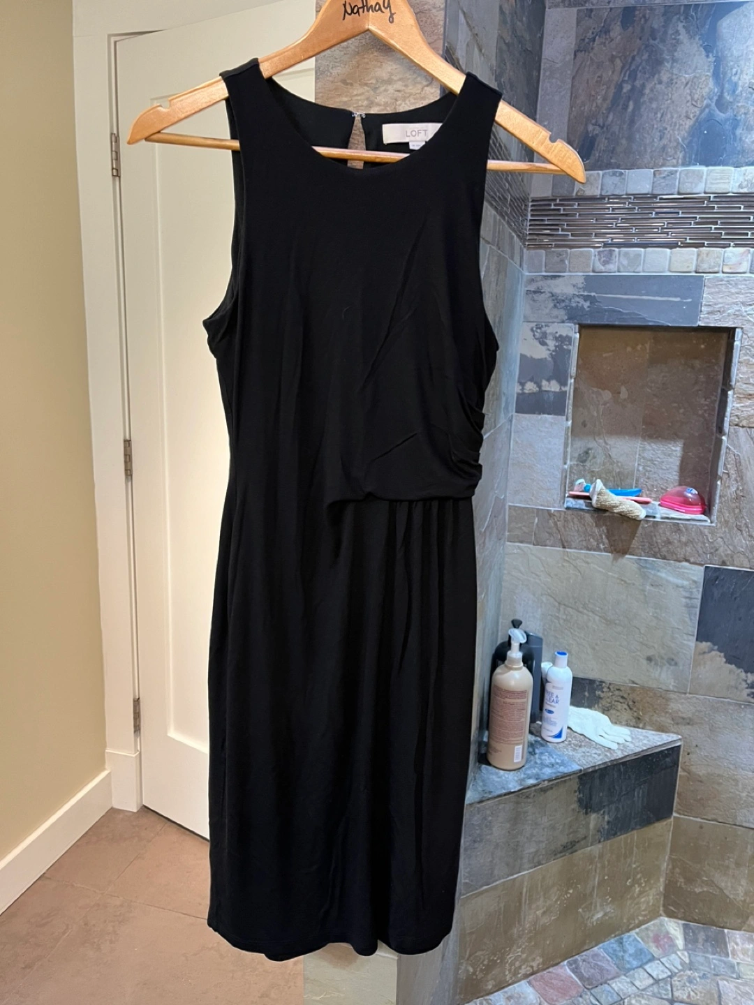 Black sleeveless dress with a keyhole back. Petite size small. Jersey knit-so comfortable!!