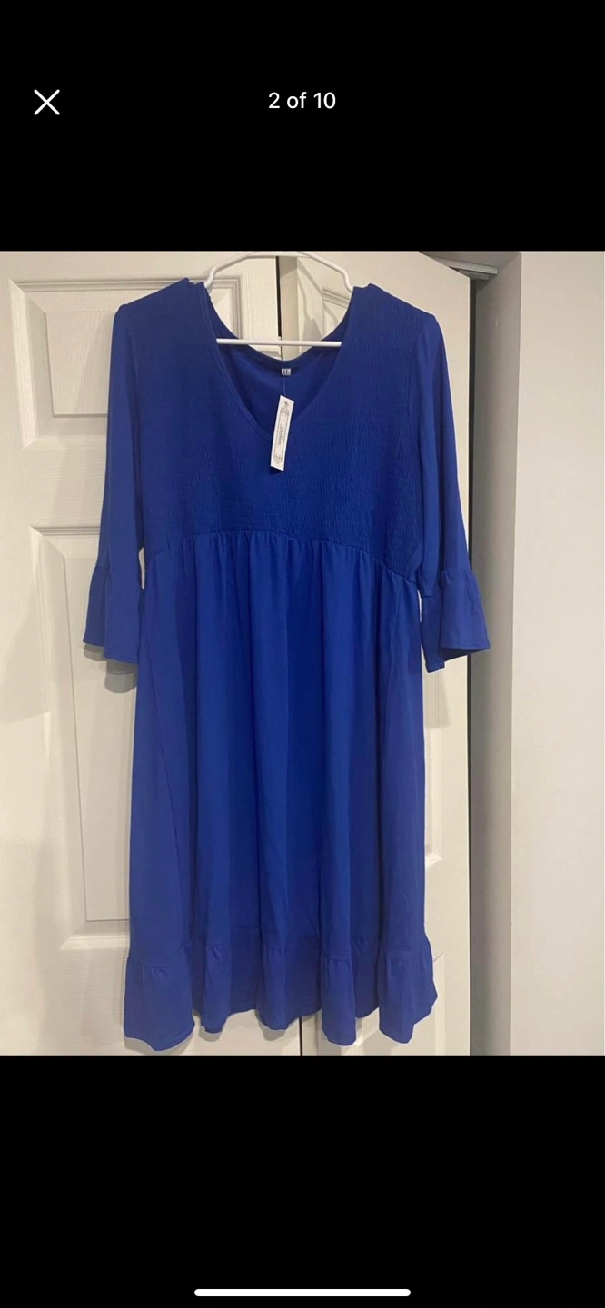 Royal blue, v-neck, 3/4 sleeve dress with ruffles. Elastic waist.
