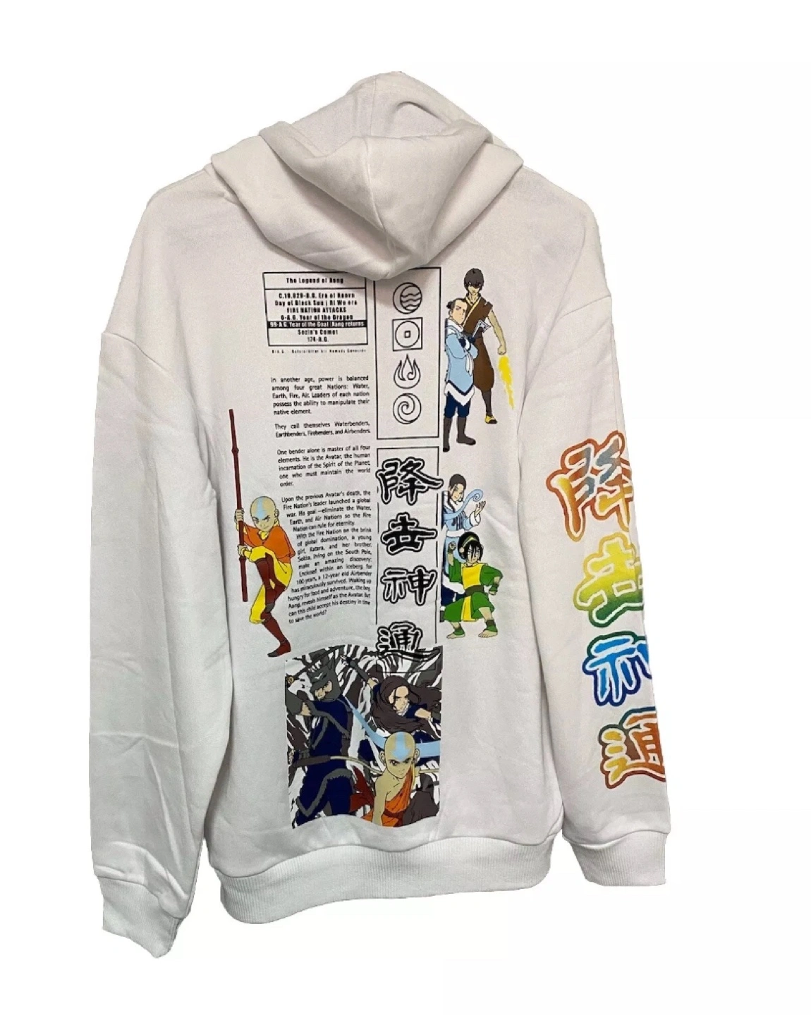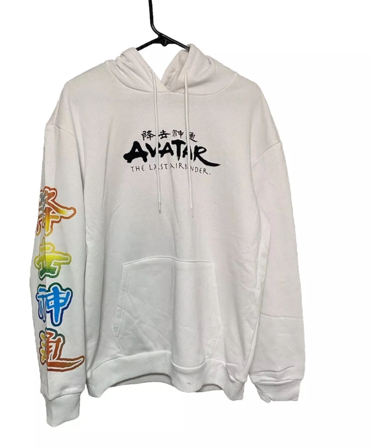 White hoodie with Avatar the Last Airbender design on the front and back. Sleeves have rainbow colours. Size L.