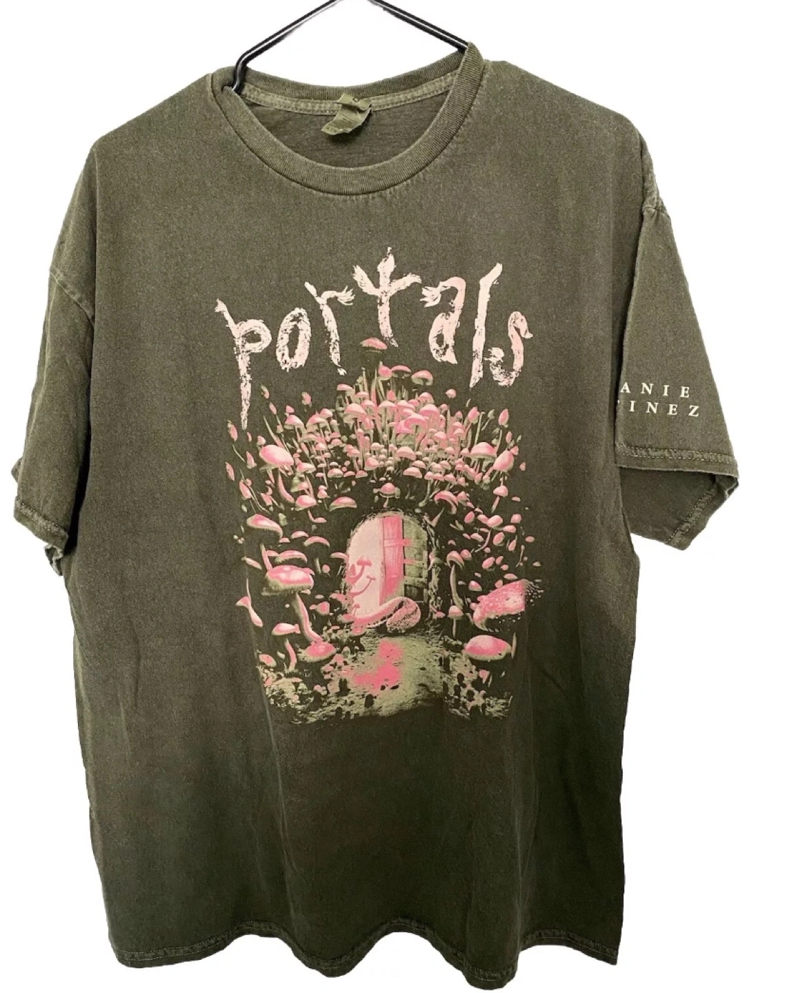 Green Gildan t-shirt featuring a graphic of a doorway in a field of mushrooms. Anie Inéz on the sleeve.