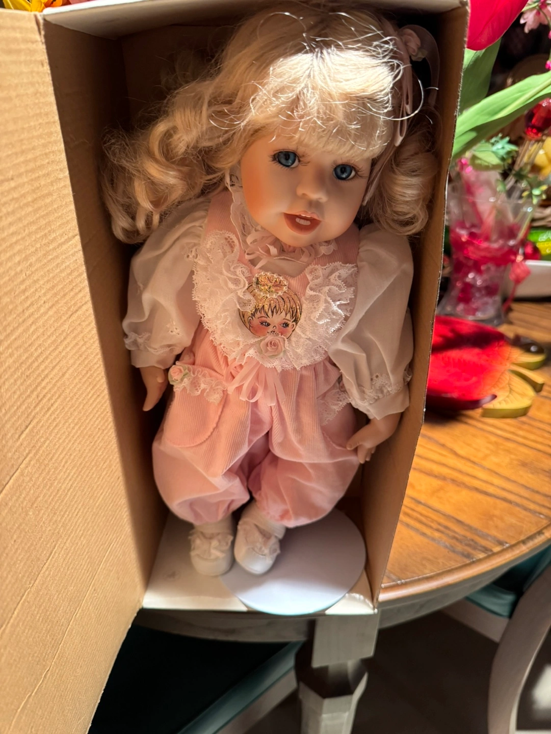 Baby face, porcelain face and hands, body is solid. Comes with a stand! Dressed in pink velvet overalls, with white blouse. Anyone collecting dolls would love to add to their collection, number#94550