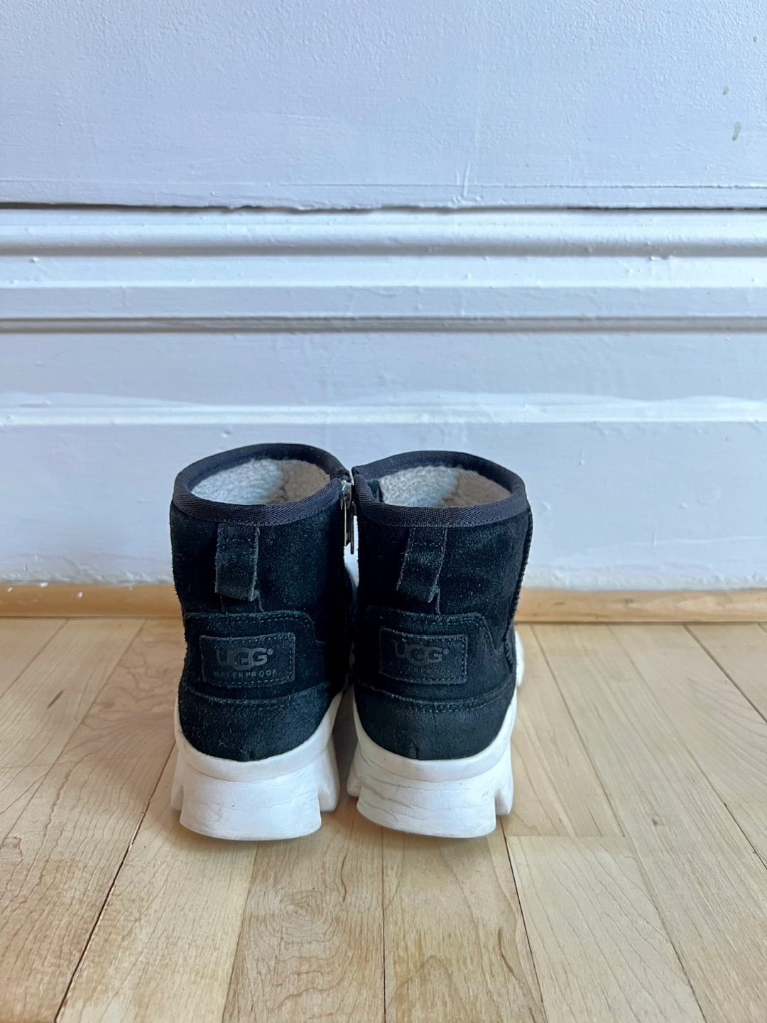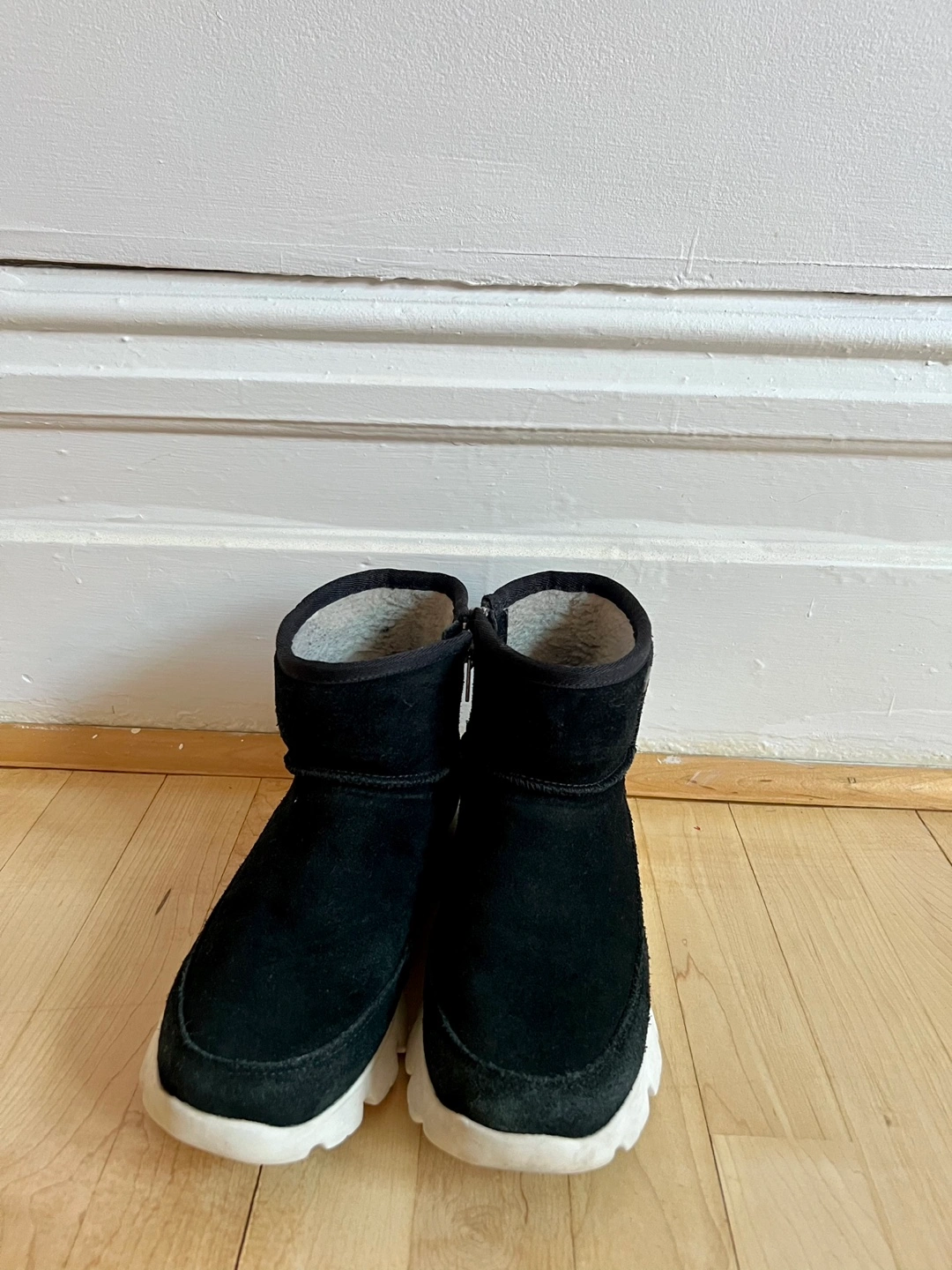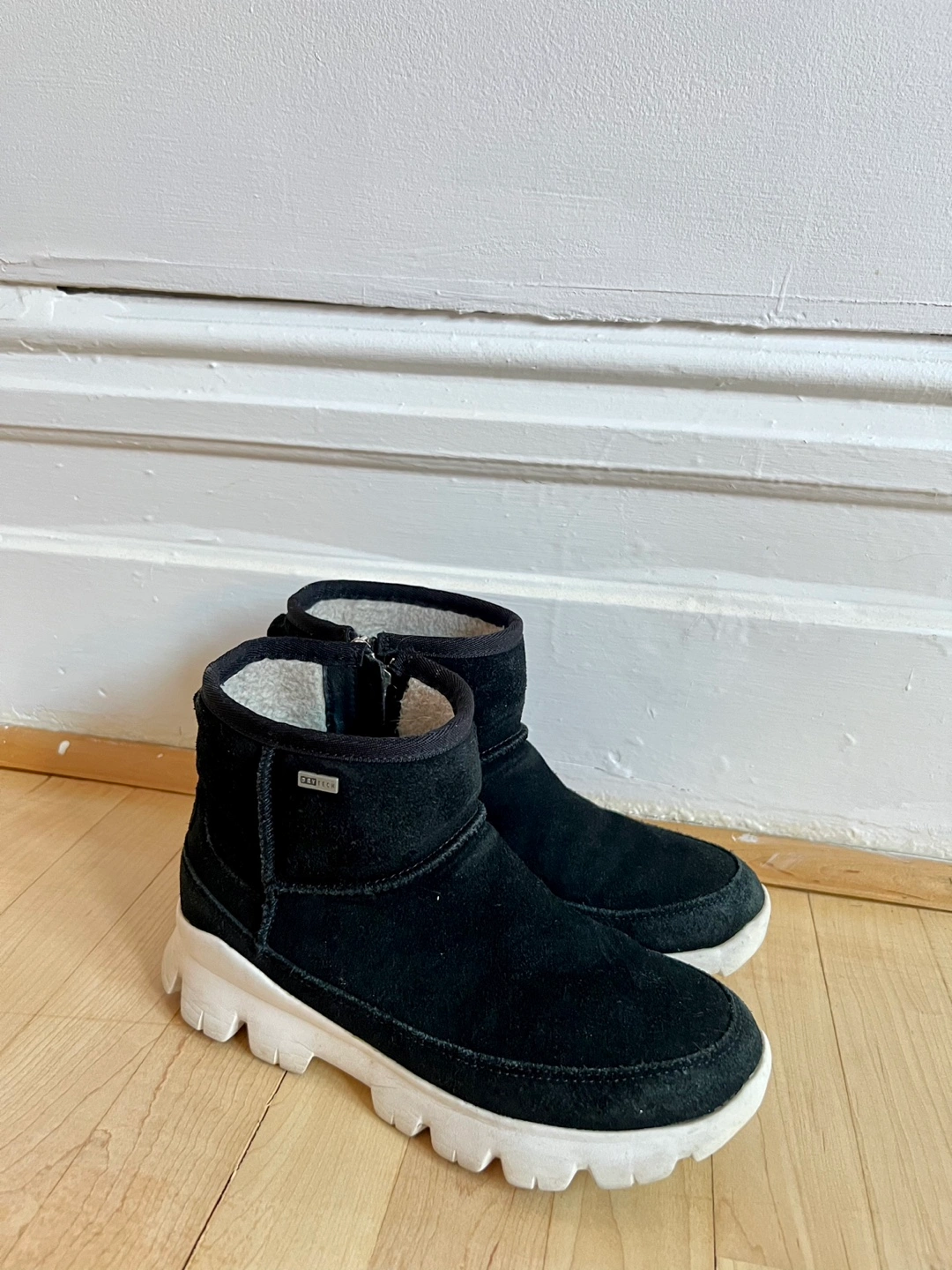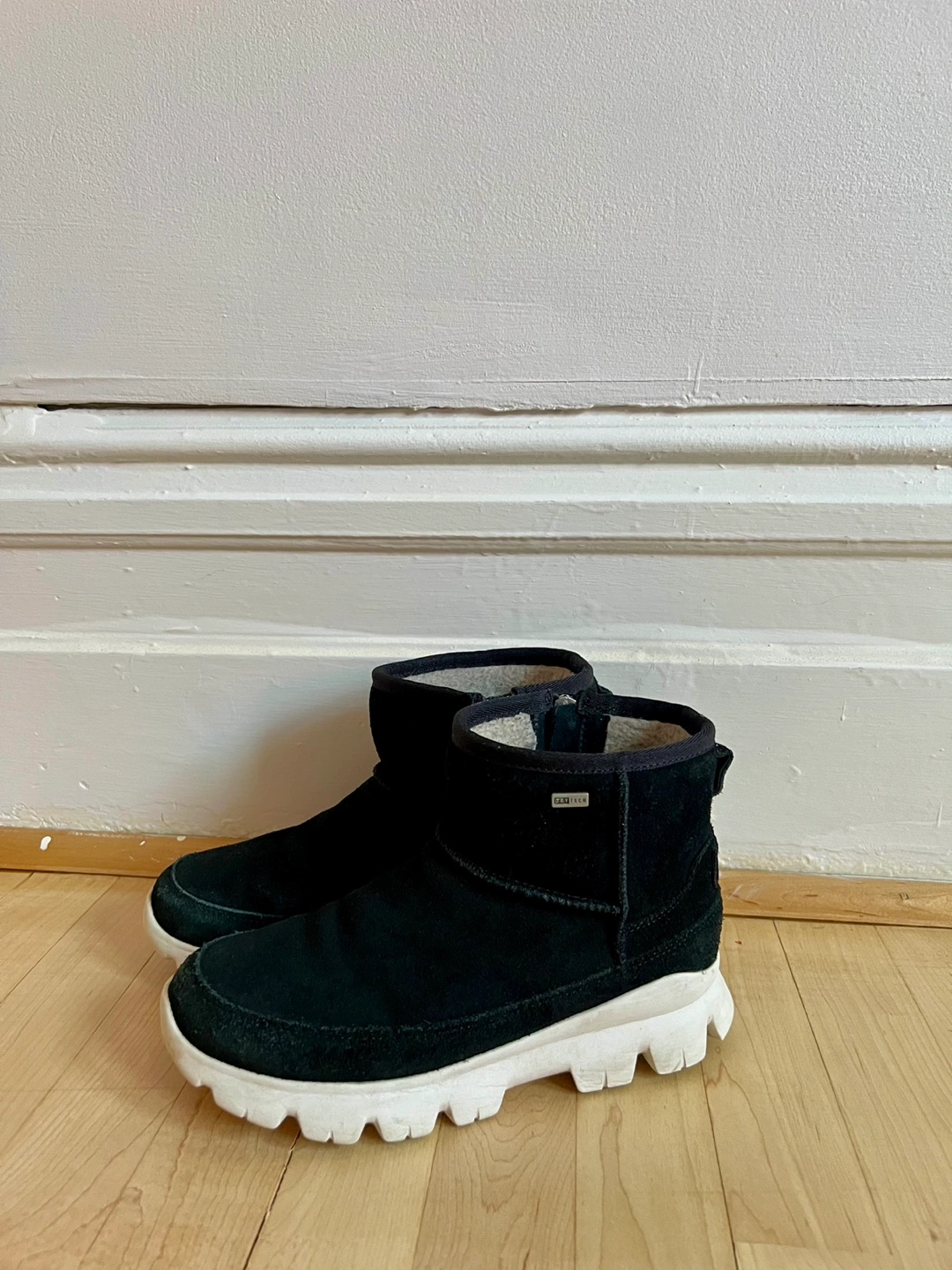 Black suede boots with white sole, zipper on the side. Fur lined. Dry Tech. Waterproof Winter boots.