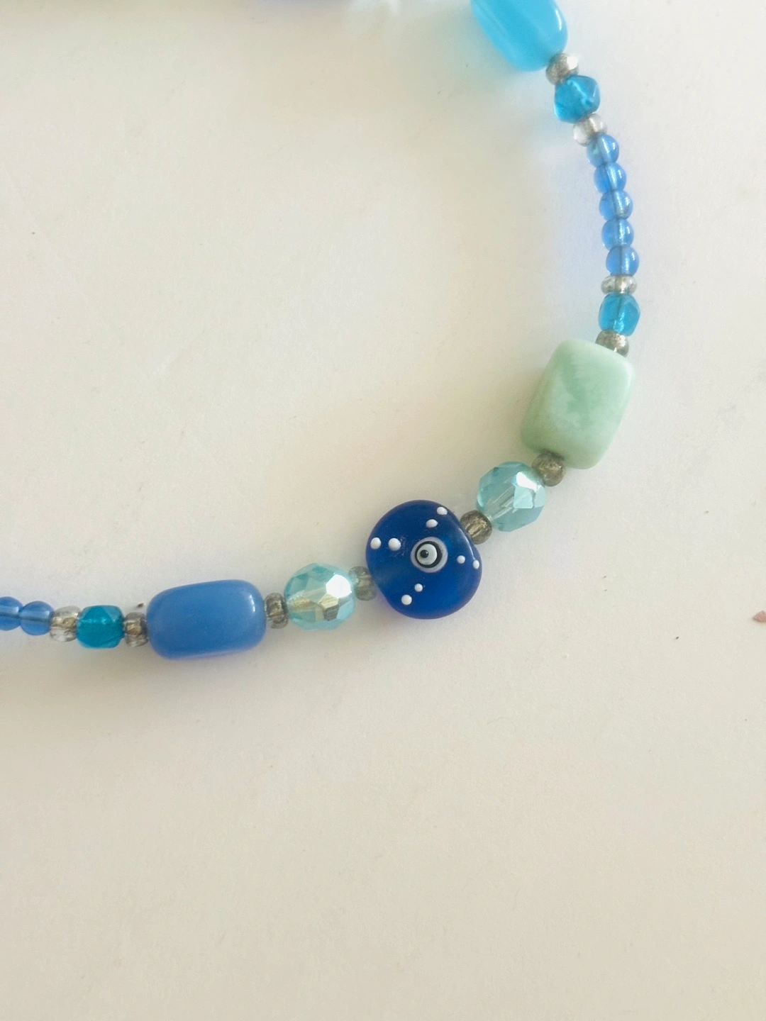 Blue and green beaded necklace with an evil eye charm. Includes various sized and shaped beads.