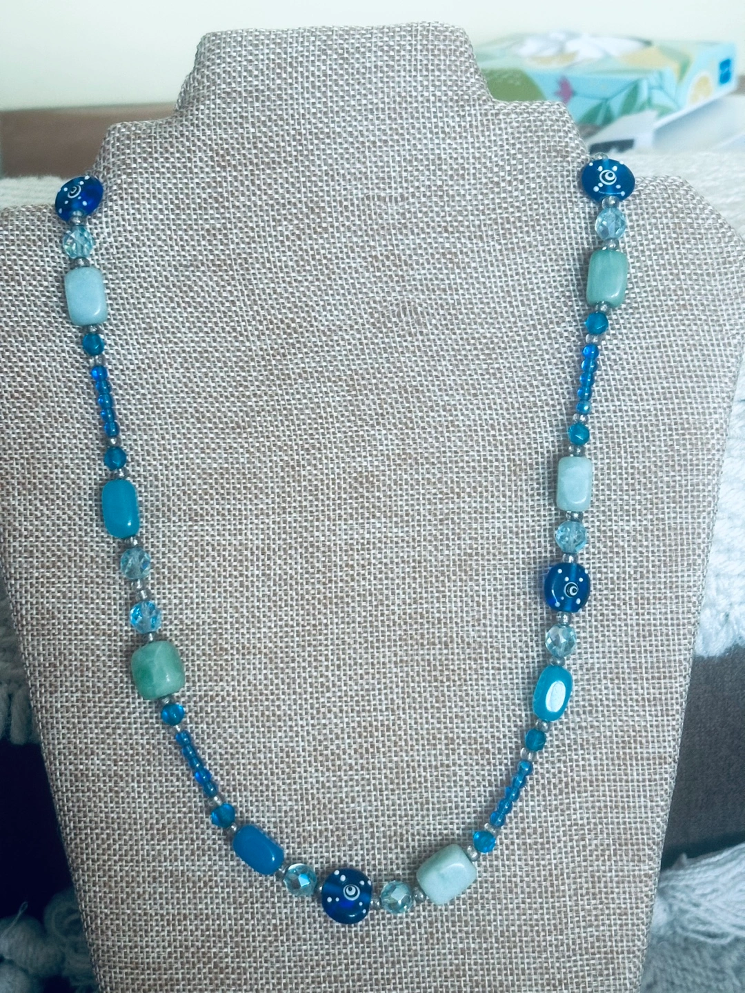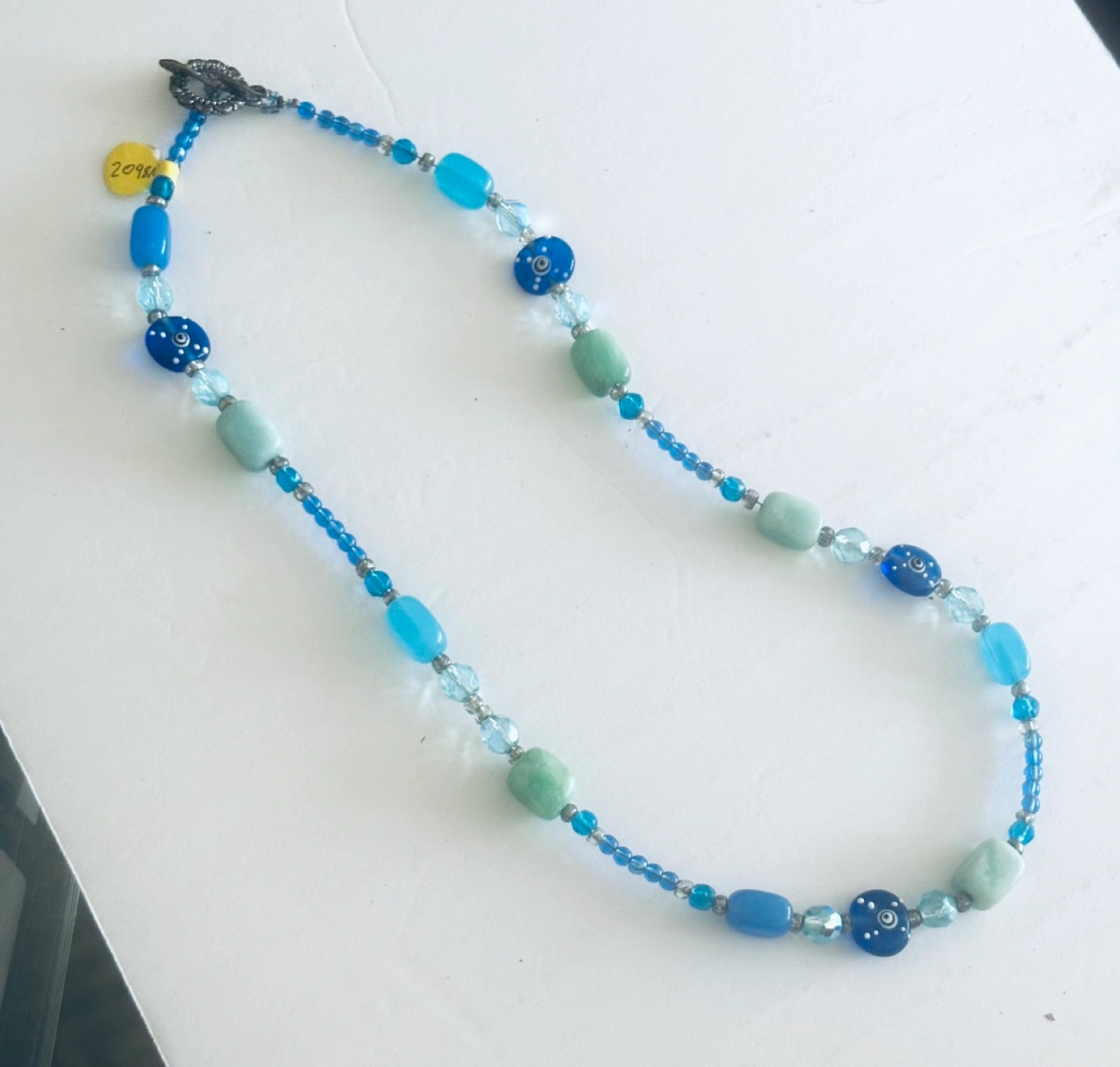 I have Various semiprecious green and blue shades rectangular stones, accented by modern "evil eye" beads for good luck and Czech glass. Finished off with sterling silver toggle clasp.