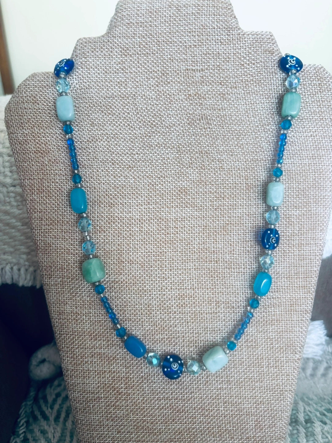 I had fun making this blue-green good luck one of a kind necklace.