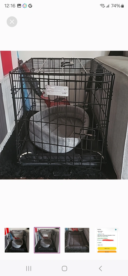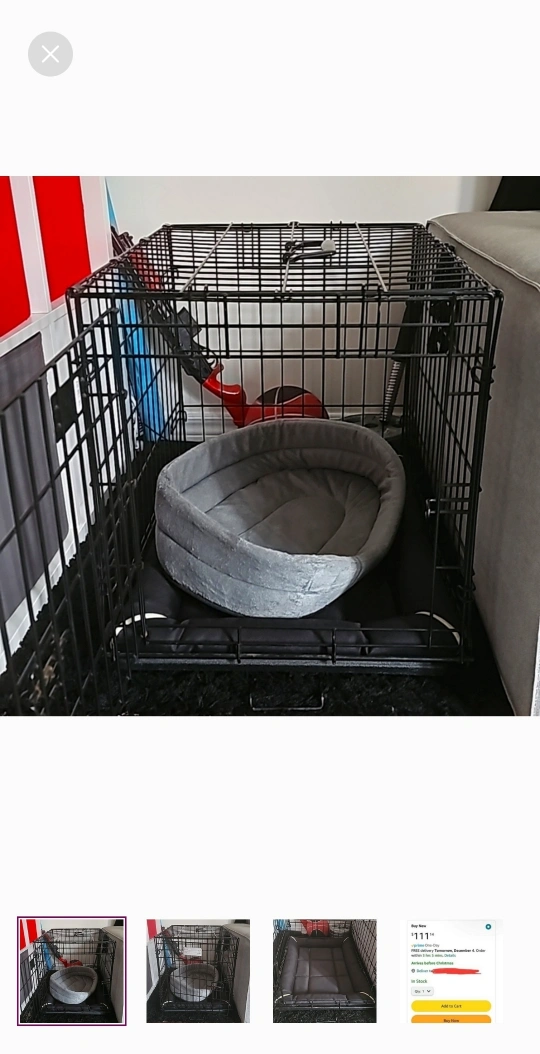 Black metal dog crate. Includes a black mat.