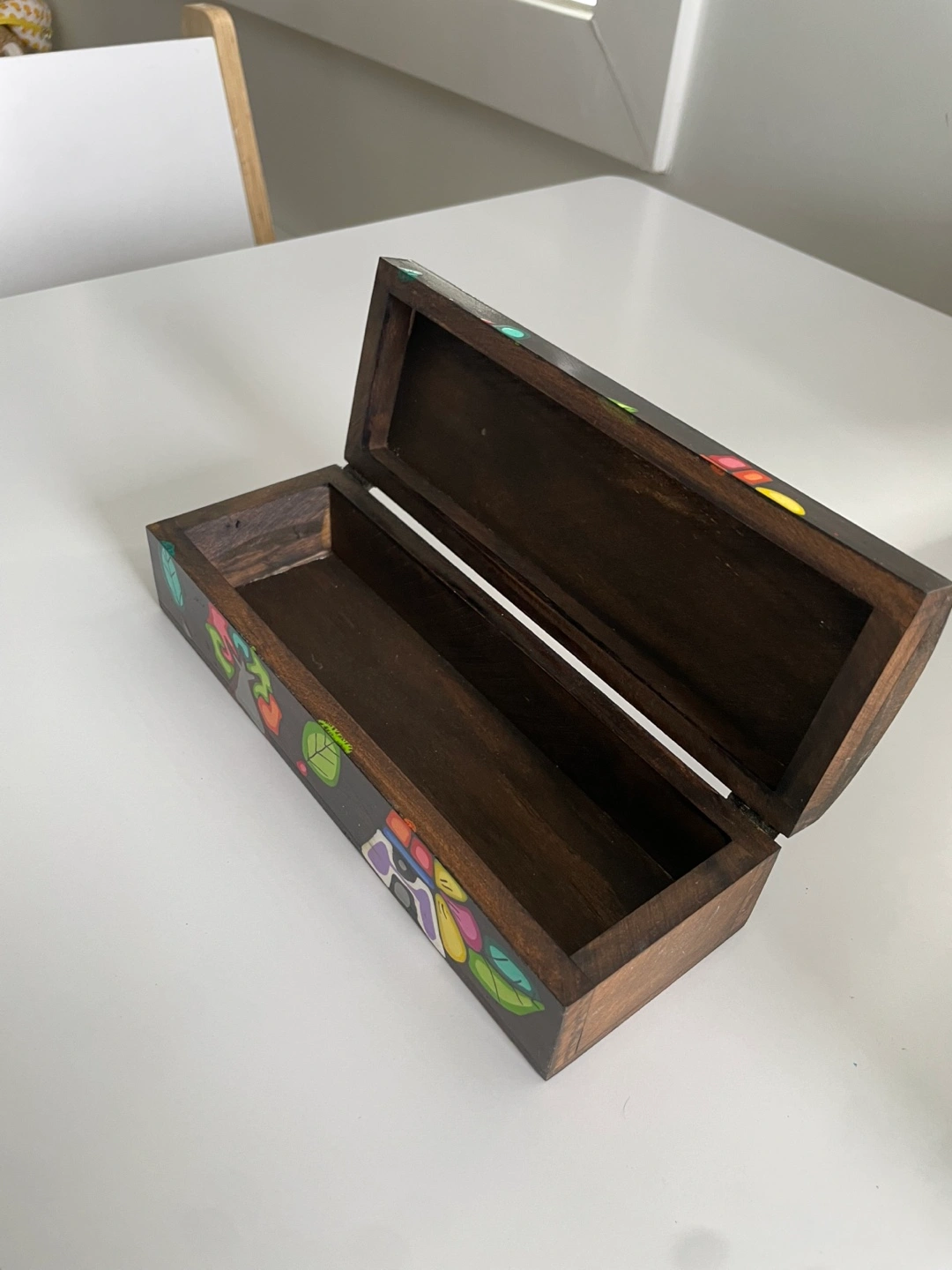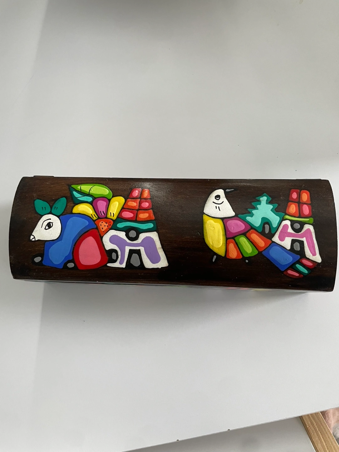 Wooden box painted with colourful designs. Hinges and clasp are functional. The box is approximately 10 cm wide and 20 cm long.