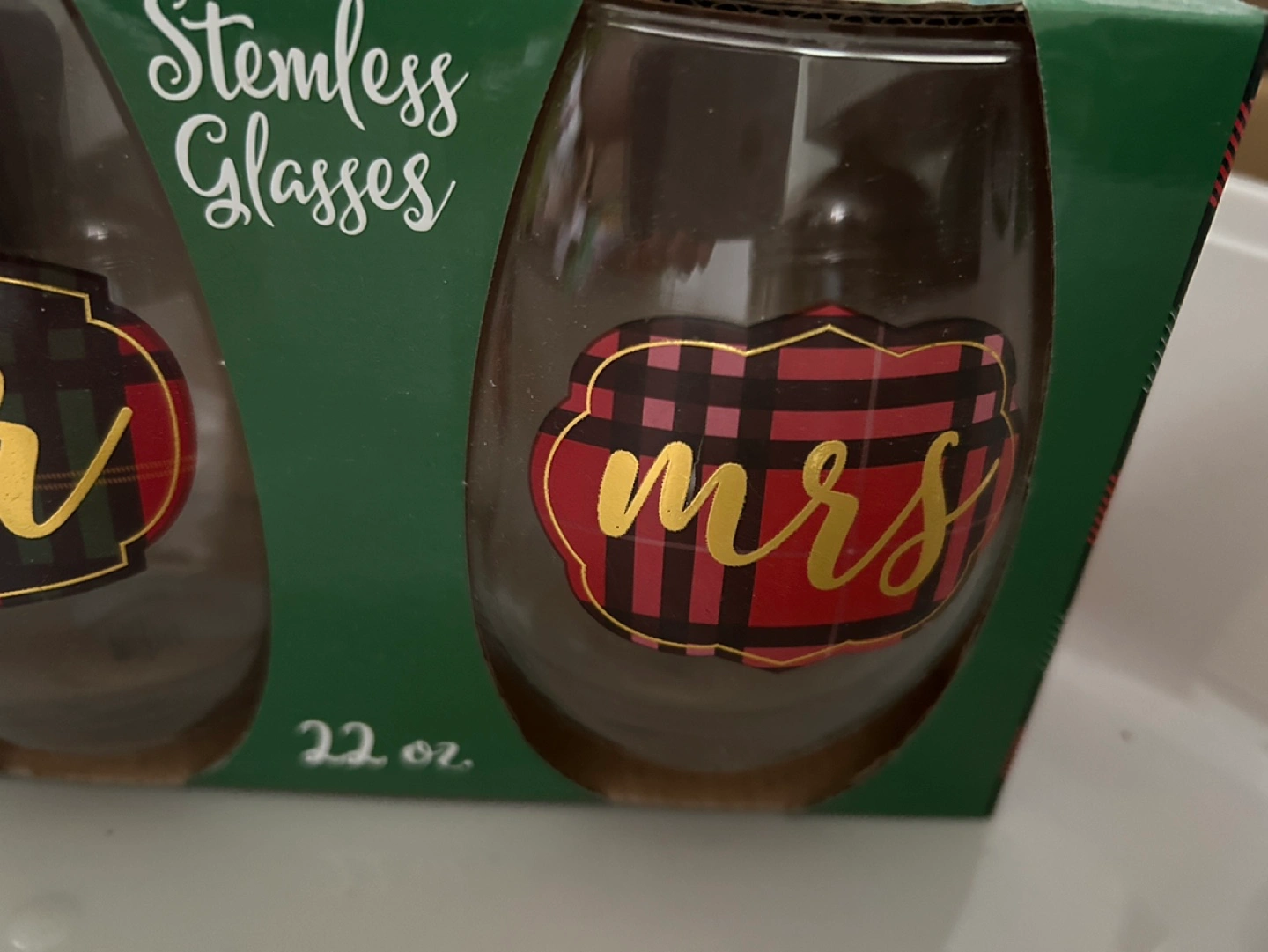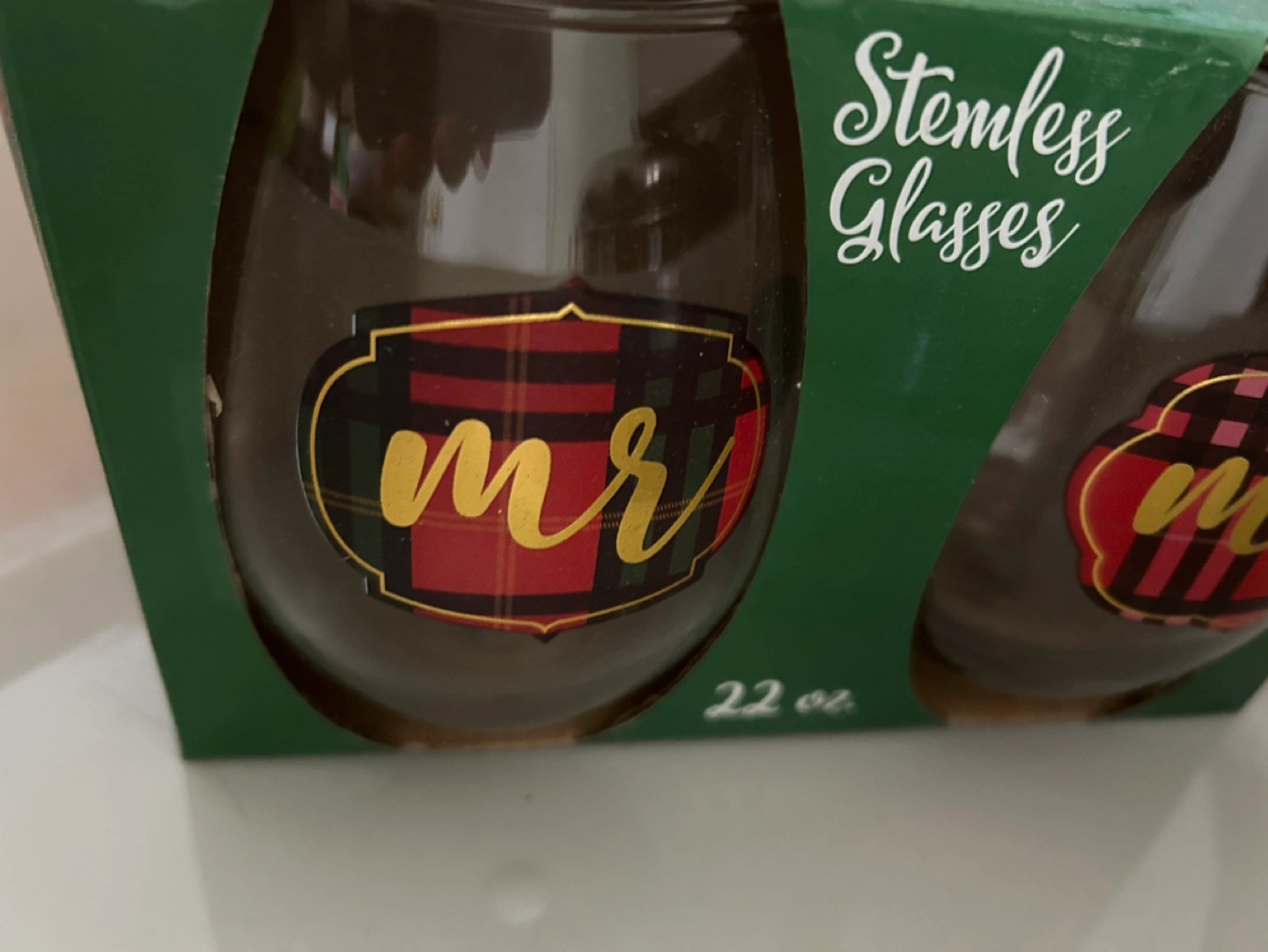 Set of 2 stemless wine glasses. 22 oz. Red and black plaid design with gold lettering.