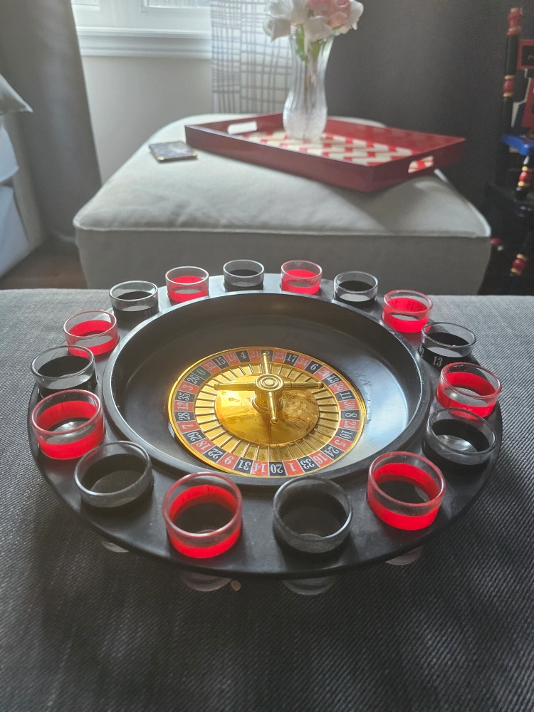 Roulette game with shot glasses. Great for parties! without dices.. fun game thing for Christmas party if you have the dices.