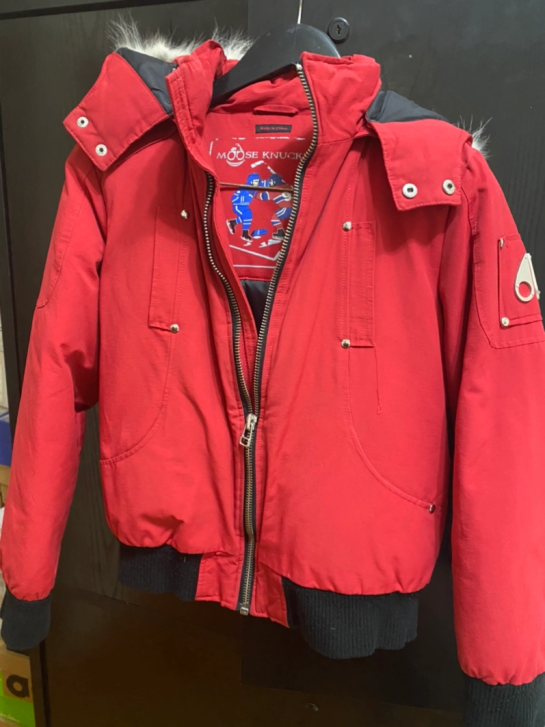 Red bomber jacket with fur hood. Has a zipper and button closure.size 14 (youth size)can fit size S (women)