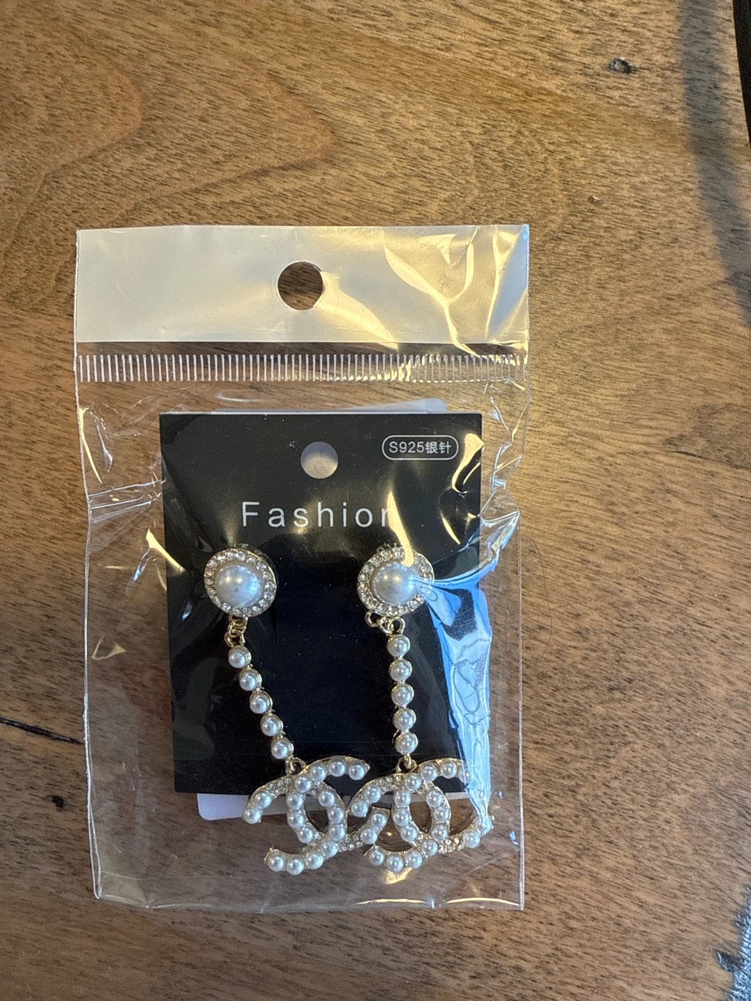 Pearl and CC logo dangle earrings. Gold-tone metal.