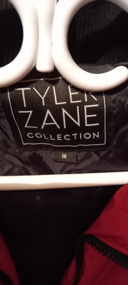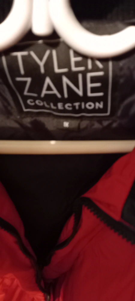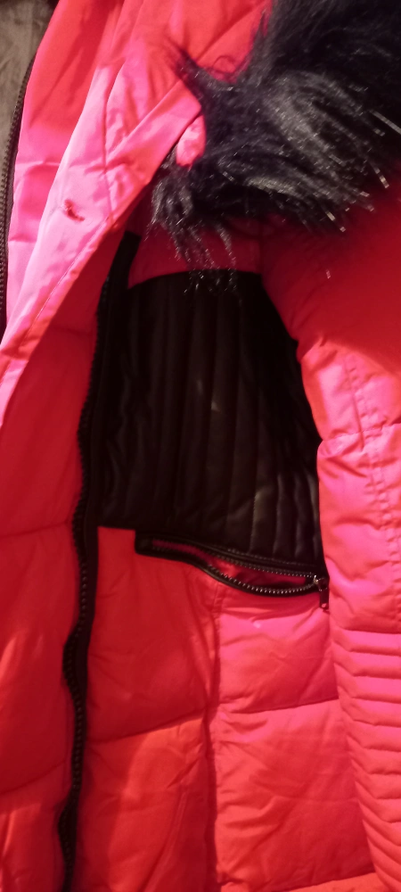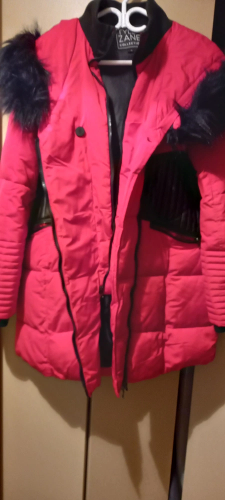 104Red winter jacket with black faux fur trim. Has black accents on the arms and back.