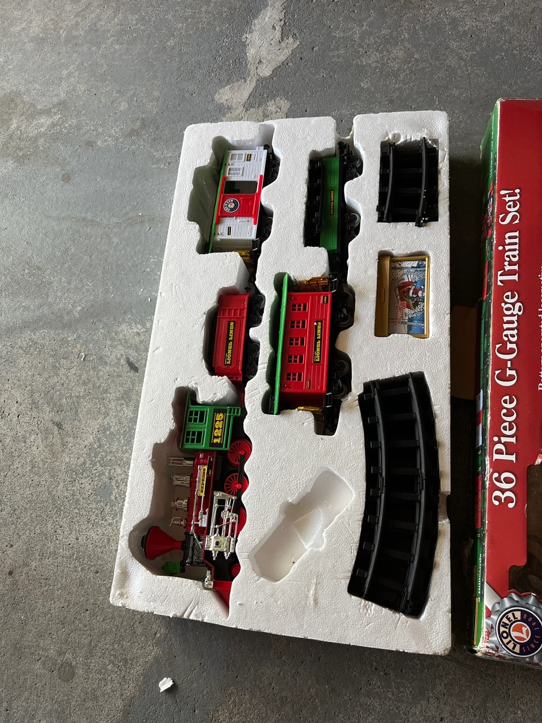 22136 piece G-Gauge train set with electronic sounds and lights. Includes locomotive, tender, boxcar, caboose, gondola and remote control. 50' x 62' oval of track. Missing remote good for under the Christmas tree Please ask for different prices