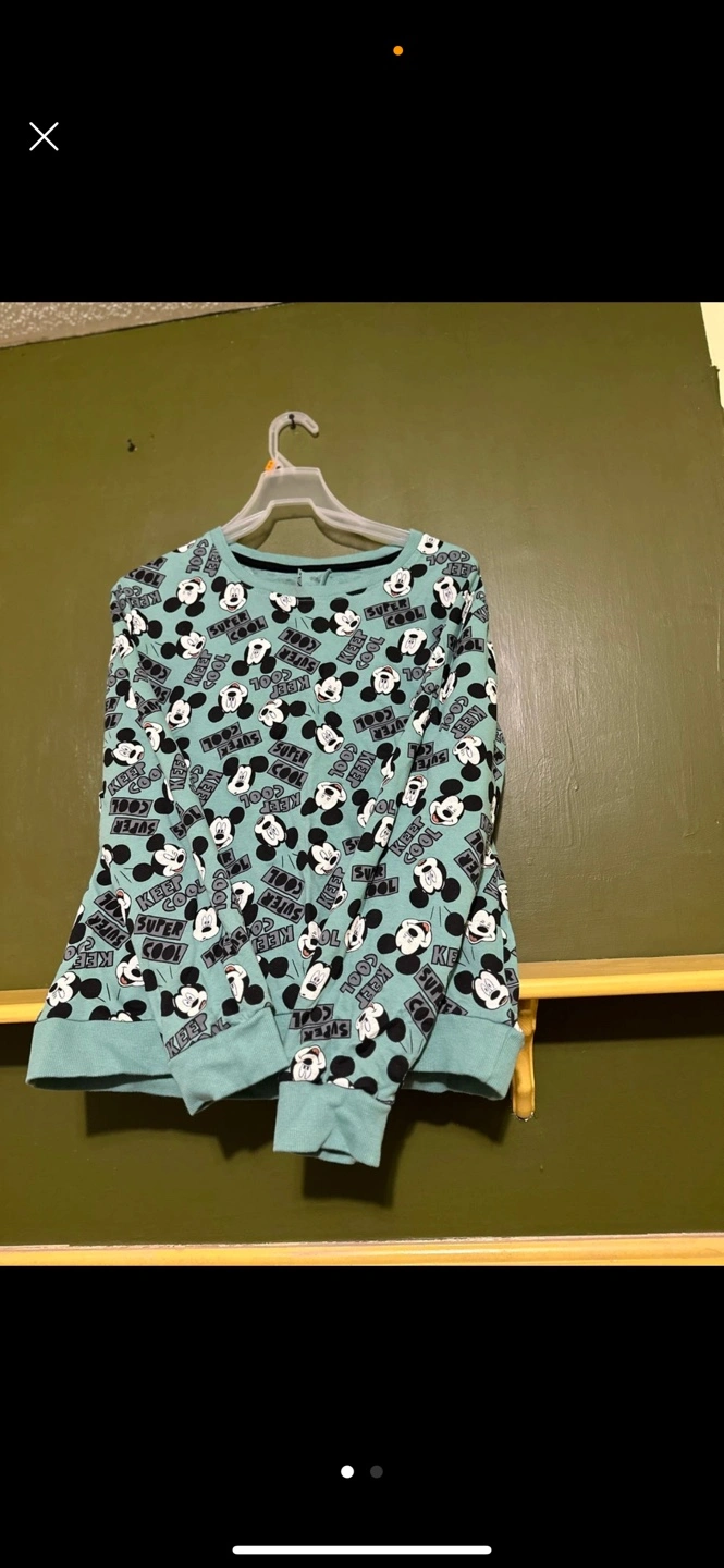 Long sleeve shirt with Mickey Mouse print. Teal coloured shirt with black and white Mickey Mouse print. It says 'Keep Cool 100%'