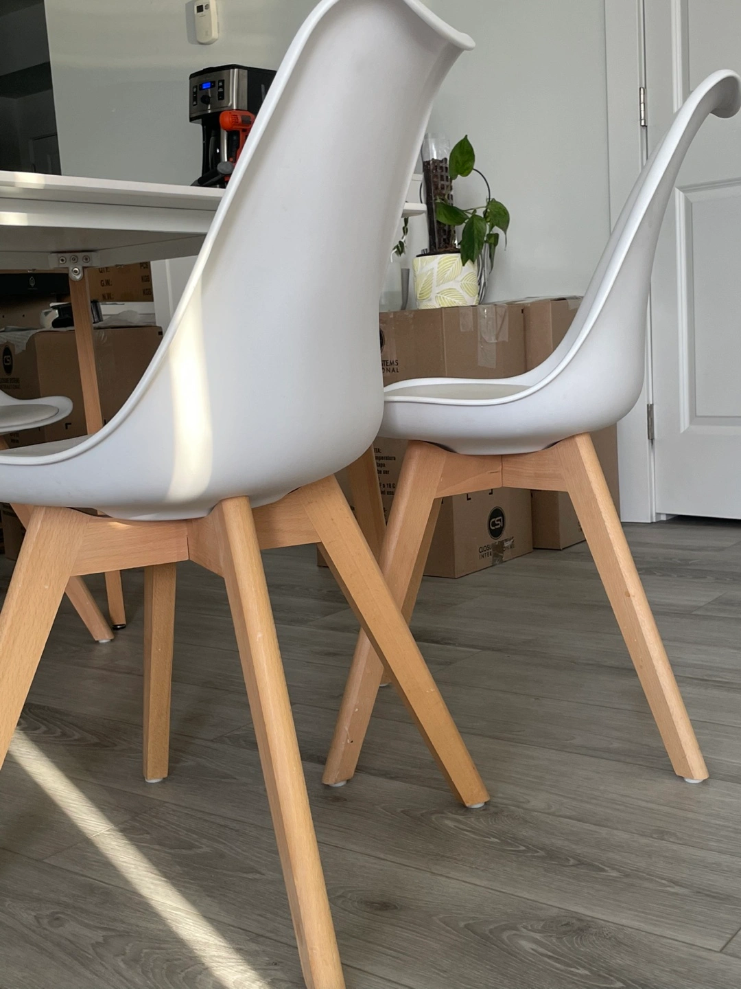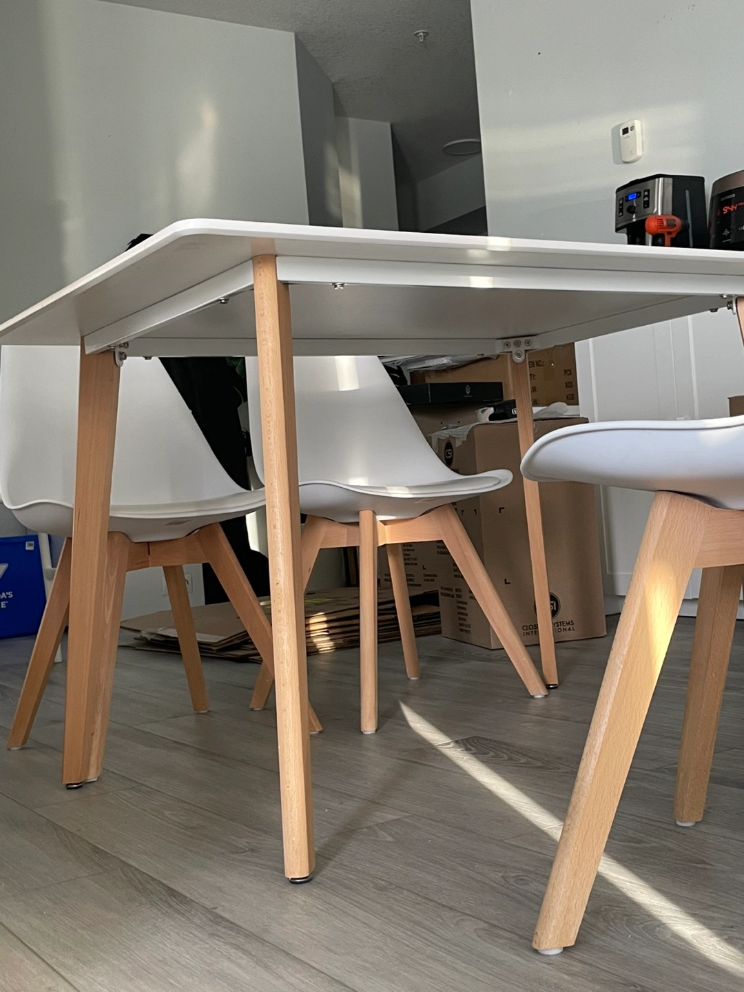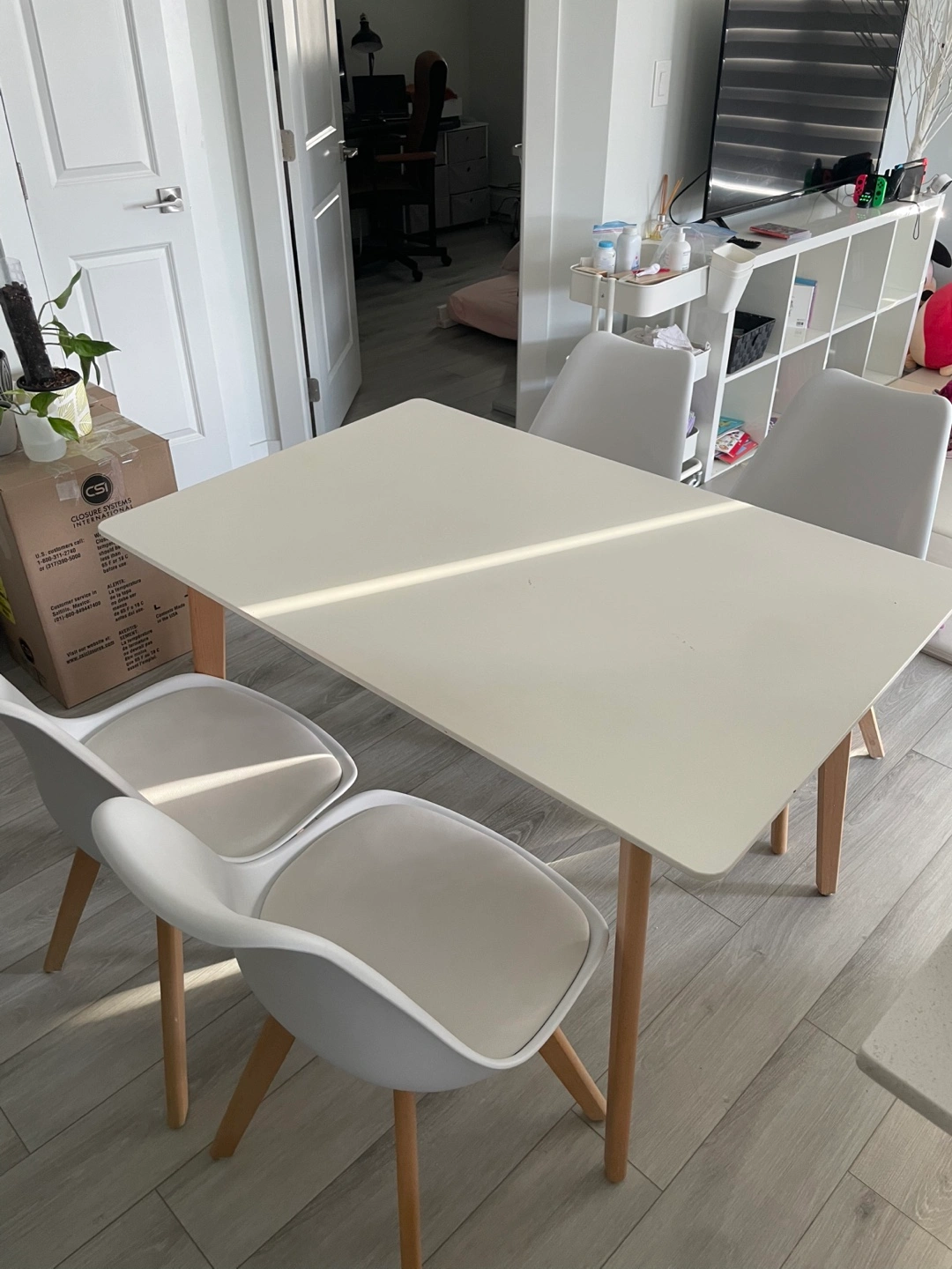 505Dining table and four chairs, white with wood legs. Minor scratches on the table top. Used for about year and a half. Moving out of province and can’t with me. Giving out to someone in need. It is your responsibility to bring help to carry it out to your car. First come, first serve!