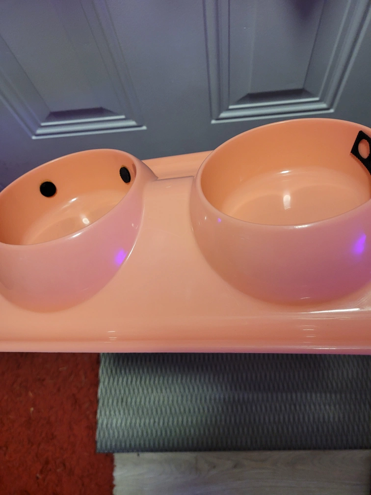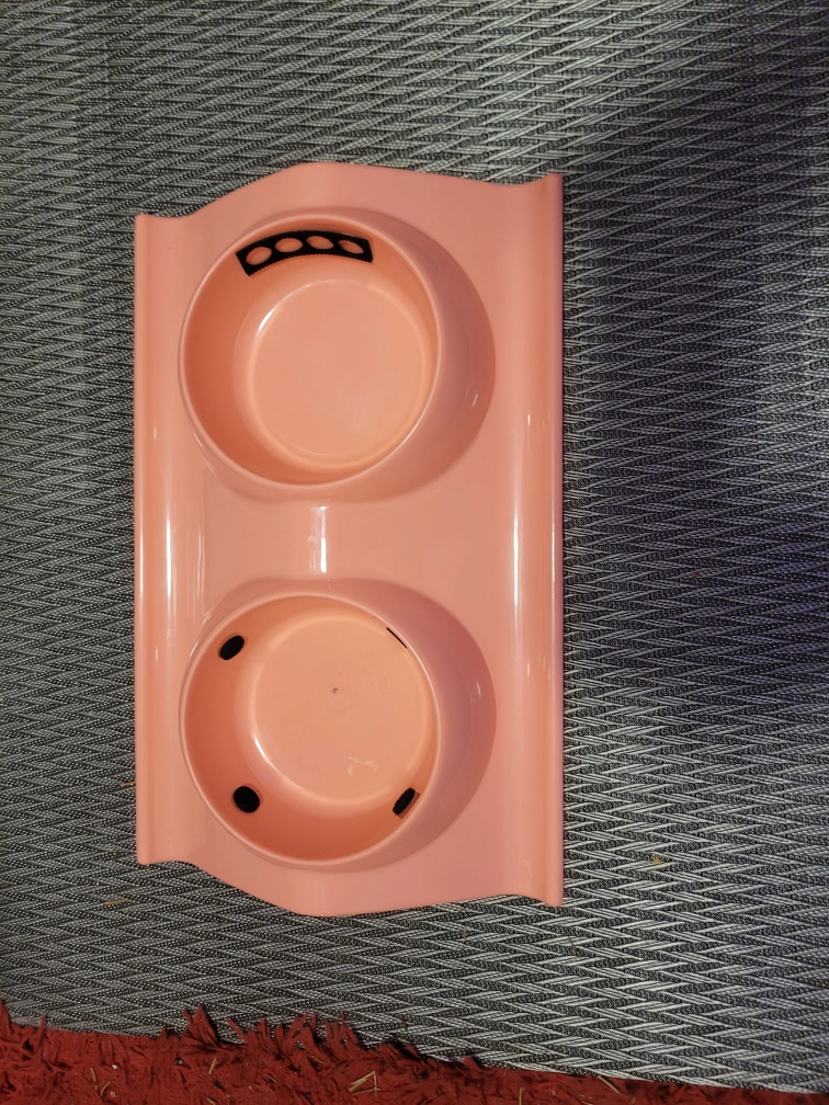 #ThriftyPicks = Two bowls and a tray. Elevated design, great for cats or small dogs. Pink plastic is gently used. almost new as dog is 5 lbs and didn't like it raised as a bowl. clean home and hypoallergenic dog.