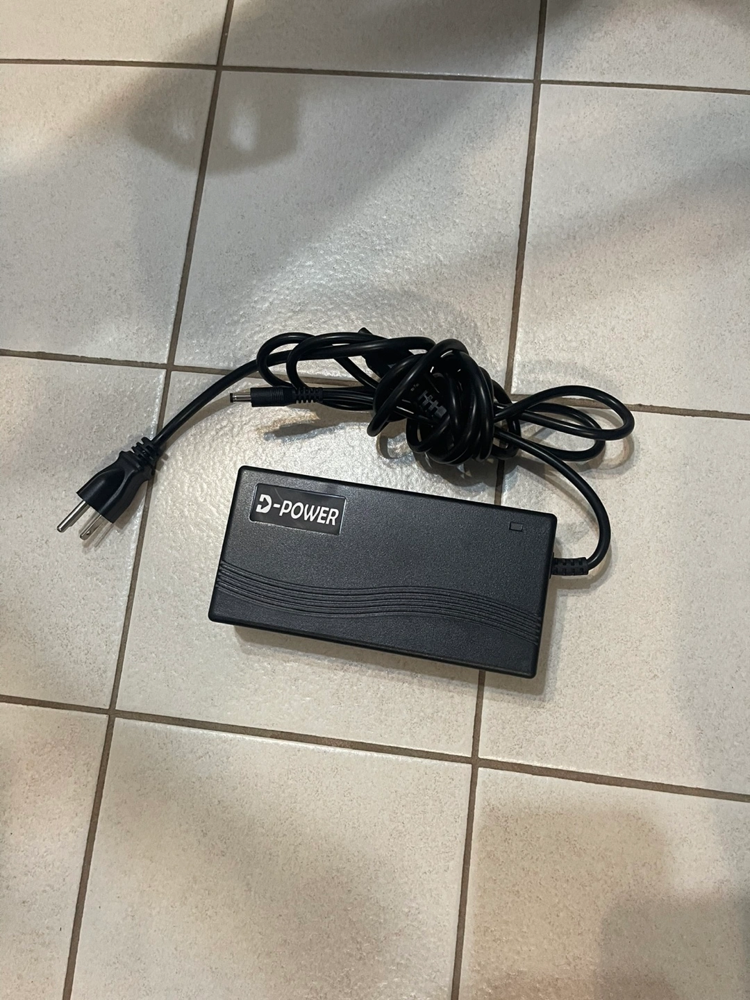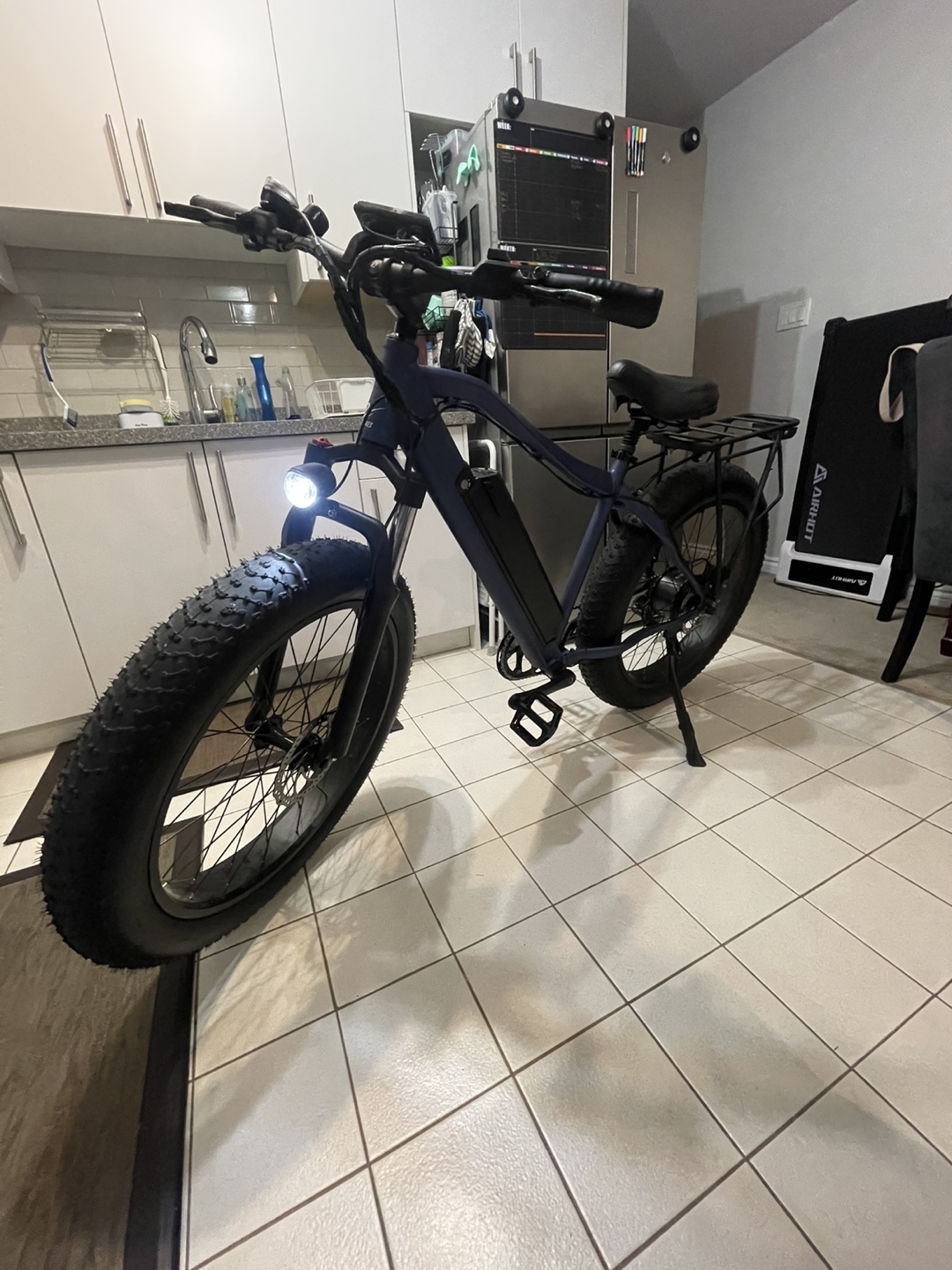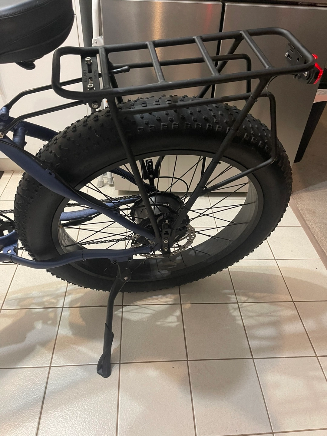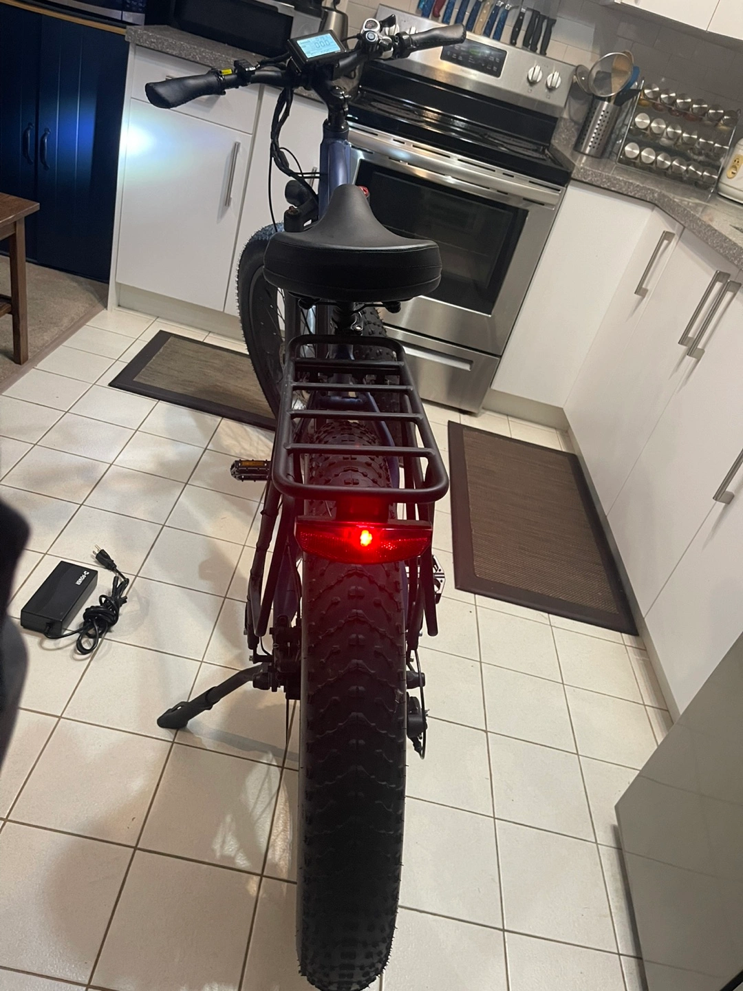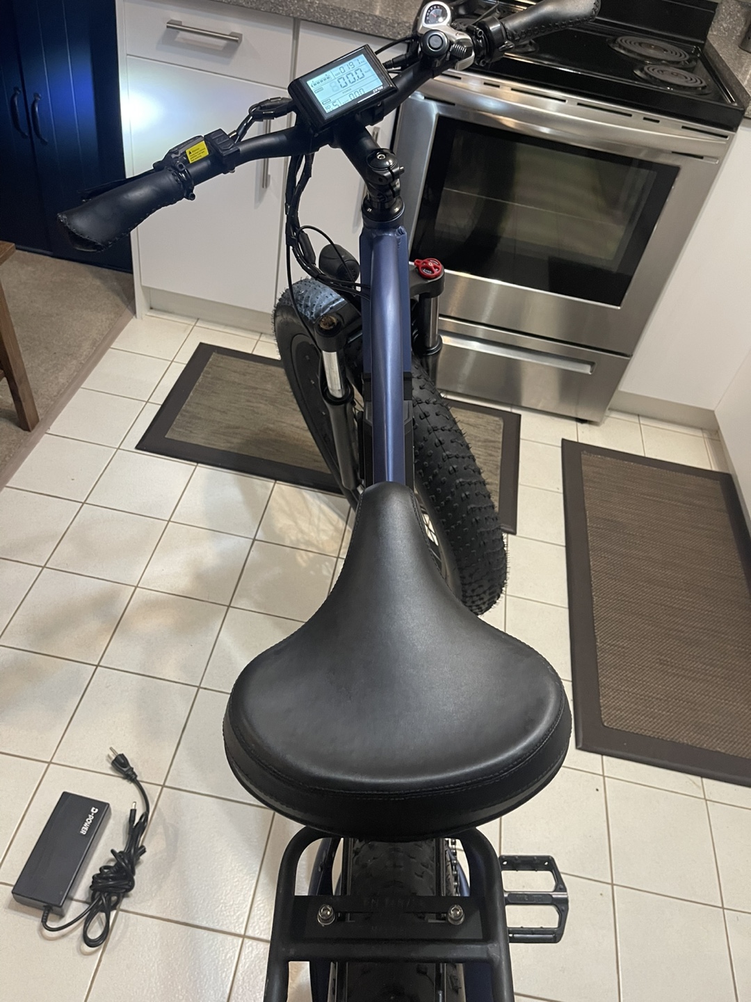 Electric bike with rear rack, fat tires, and Bafang motor. Includes a charger and a battery.