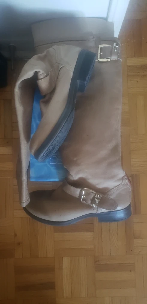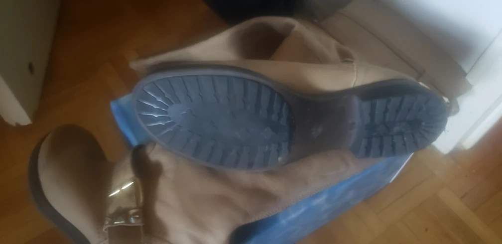 473Tan knee-high boots with a side zipper and buckle detail. Red zipper on the back. Bought in Miami, Florida. Wrong size, can't return them