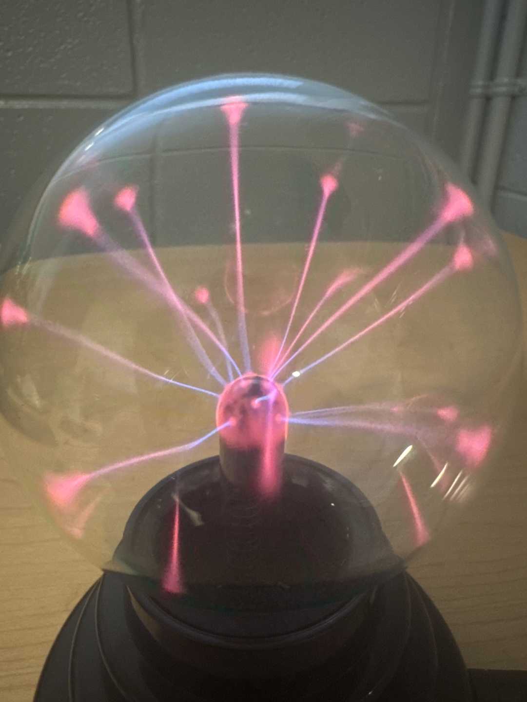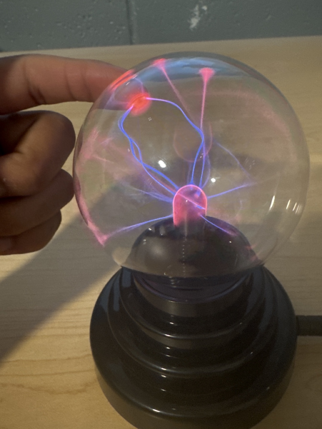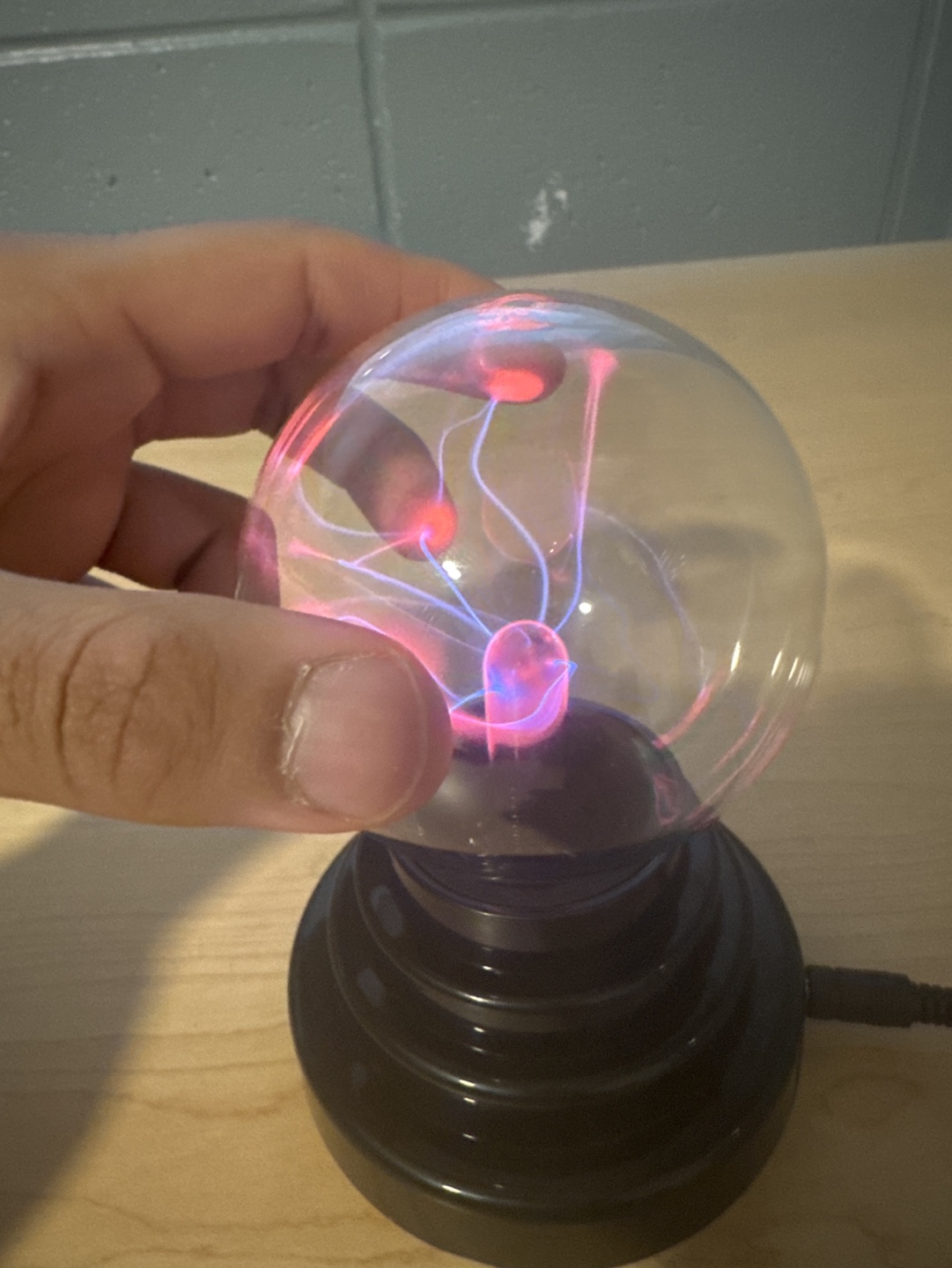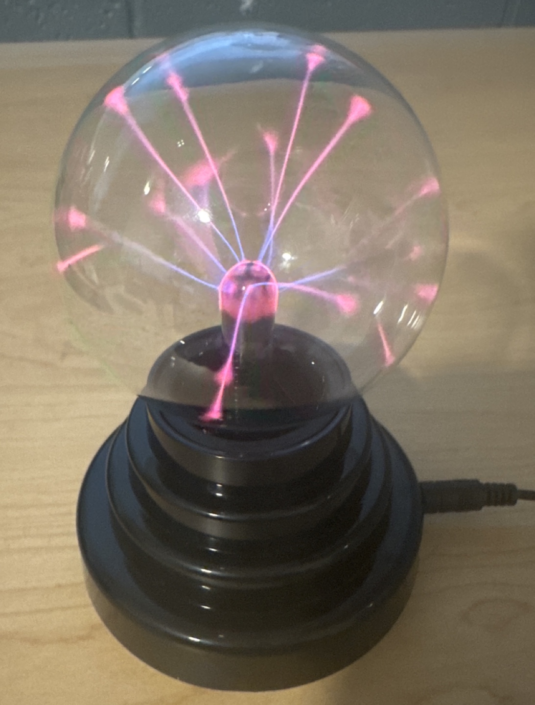 Plasma ball with a black base and a clear glass sphere. Emits pink and blue light. Comes with a power cord.