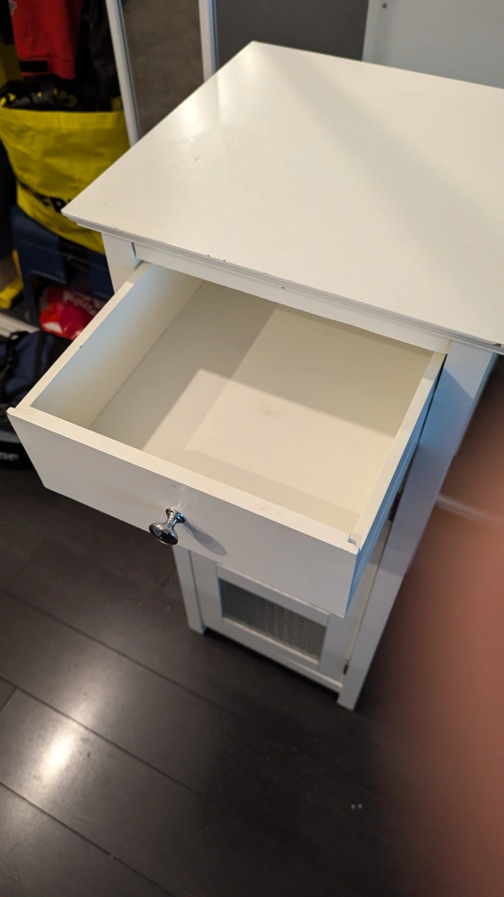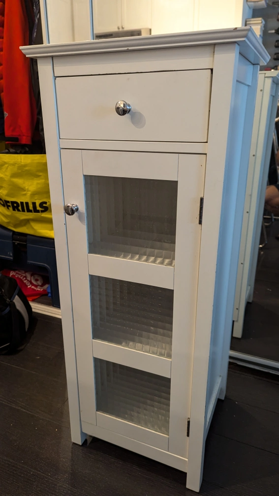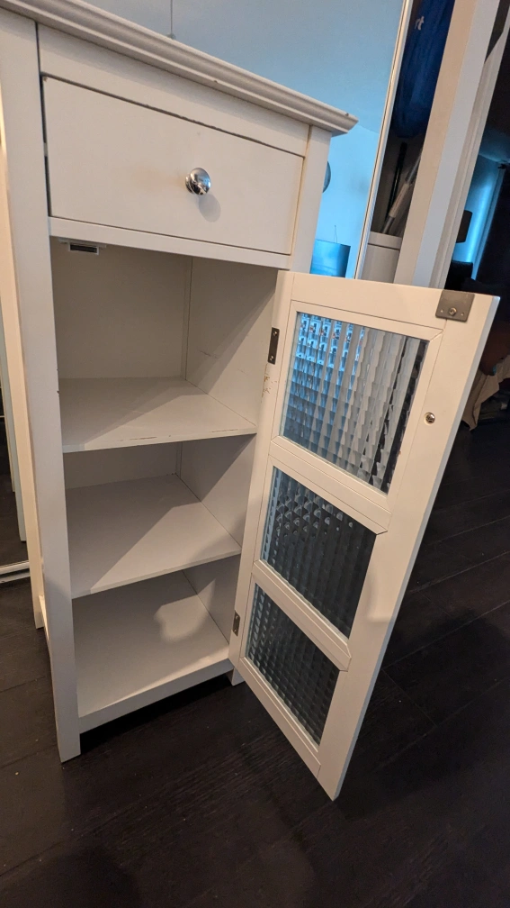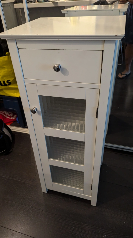 PLEASE READ CAREFULLY. Small white cabinet with one drawer and a glass door with shelves. Great for storing small items or accessories. There are some minor blemishes as you'd expect, but can be easily touched up with some paint or white-out marker. The price reflects the imperfections.