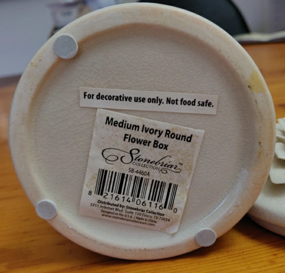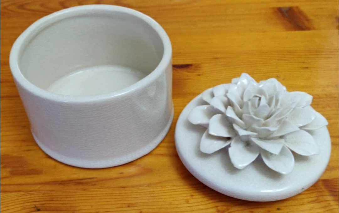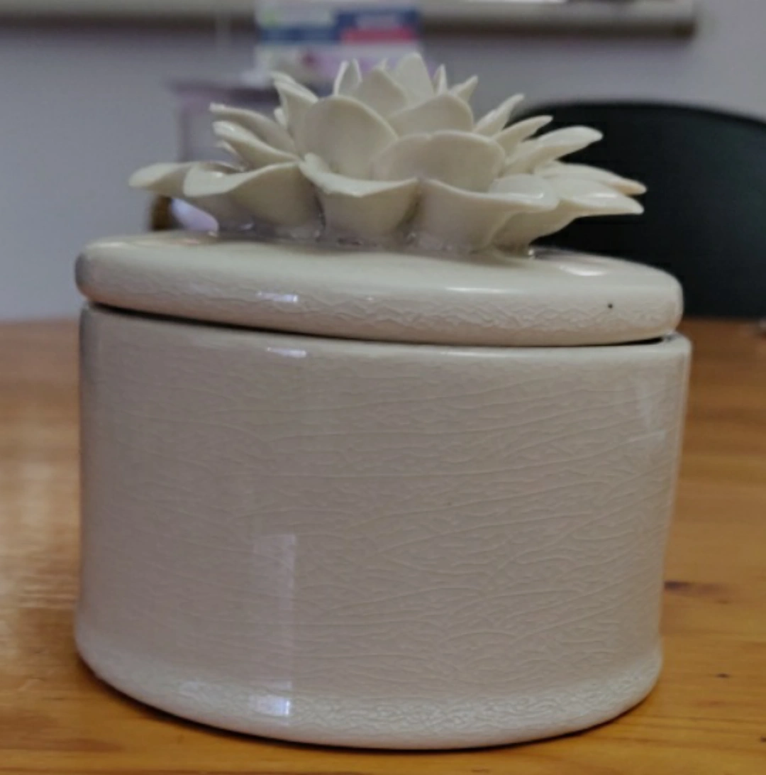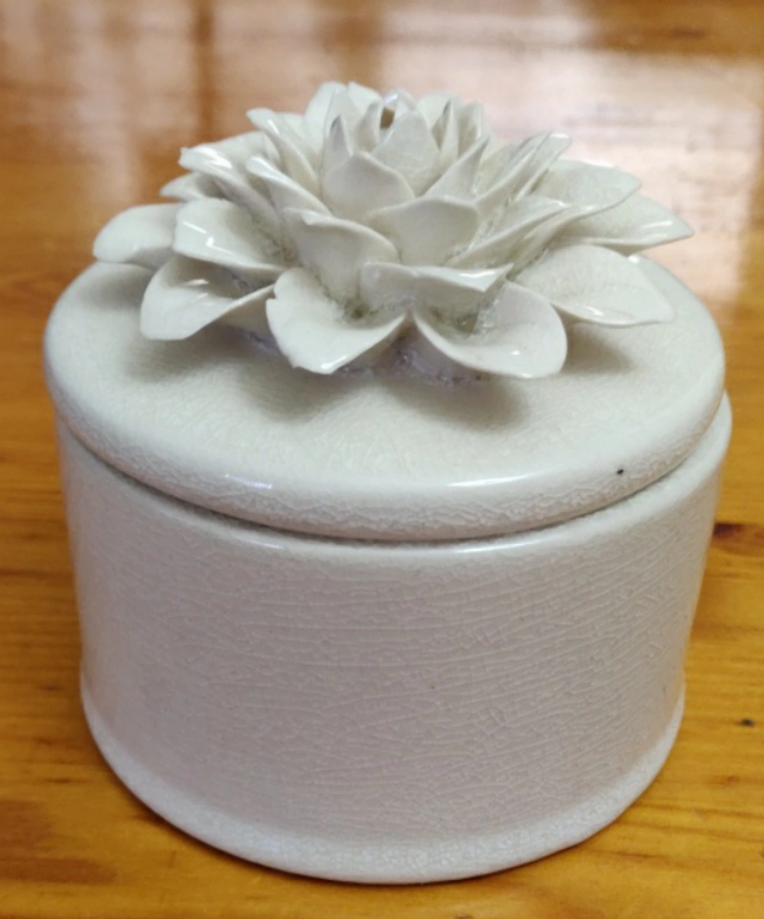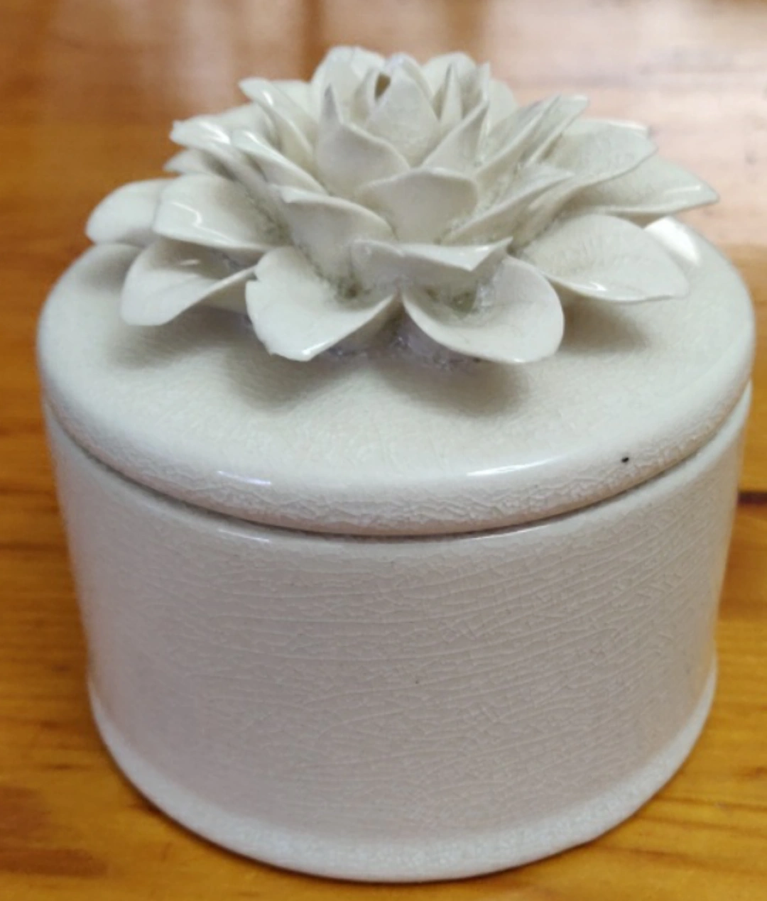 511Cream coloured ceramic box with a floral lid. Decorative use only, not food safe. Comes from a smoke-free pet-free home.