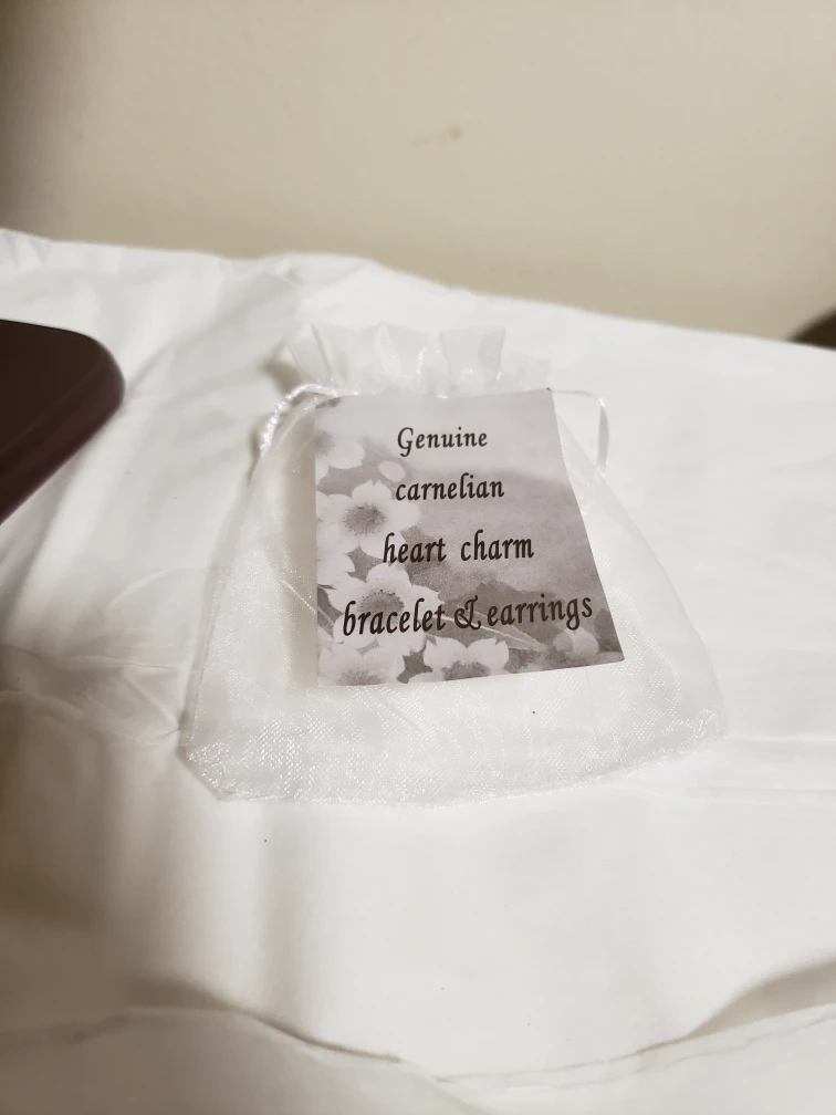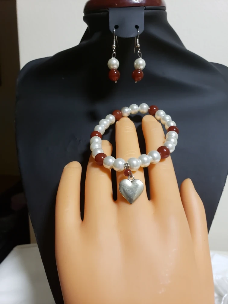 White pearl bracelet with carnelian beads and a silver heart charm. Matching carnelian and white pearl earrings. Comes in a pouch.