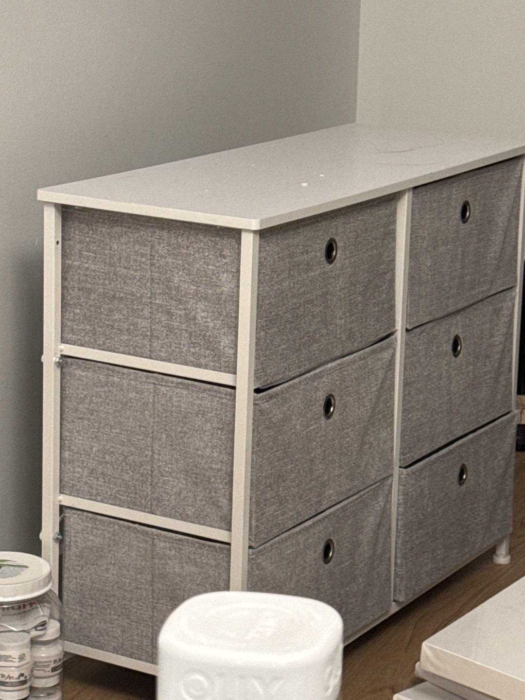 White 6-drawer storage organizer with grey fabric drawers. Good condition.