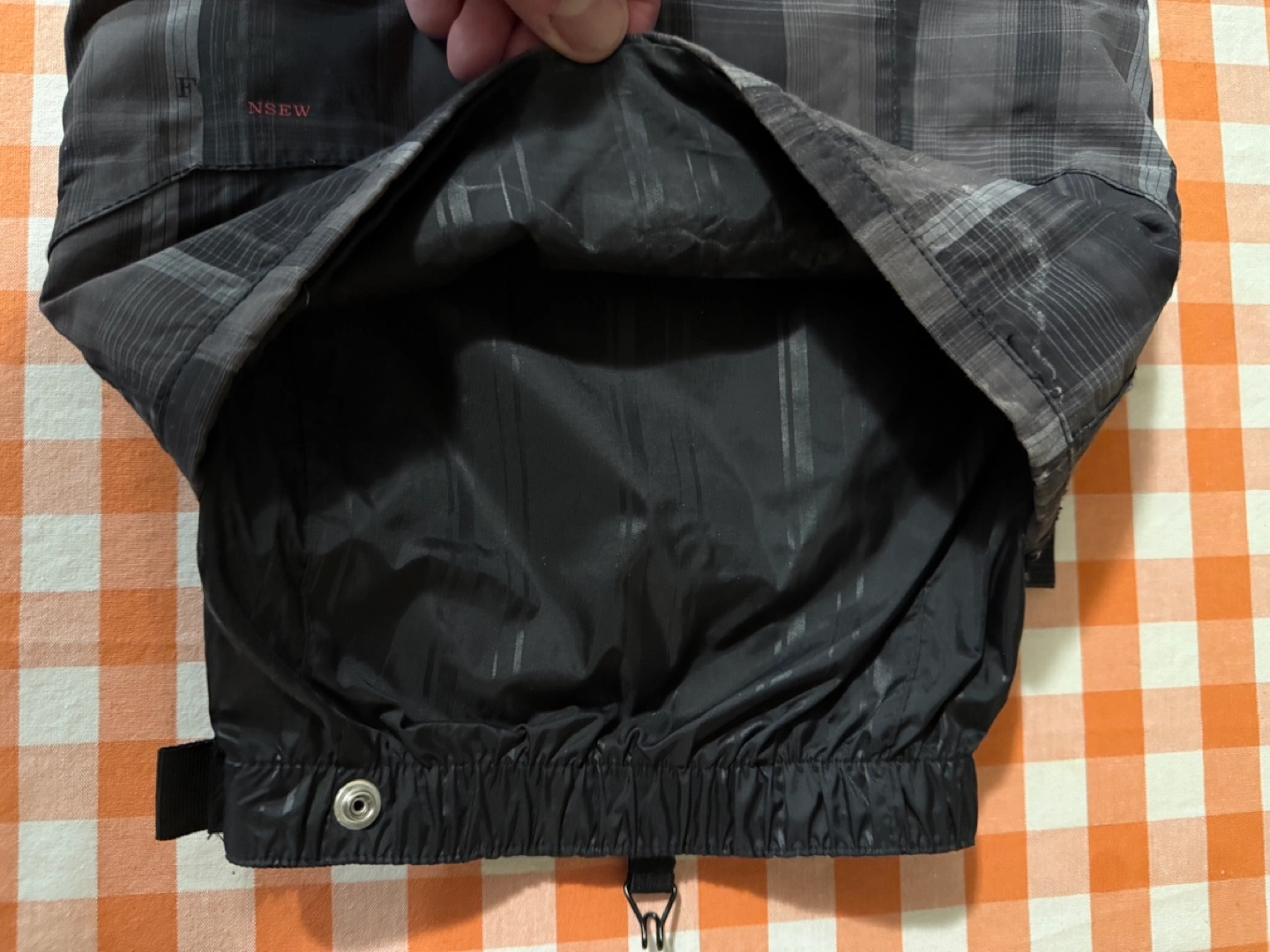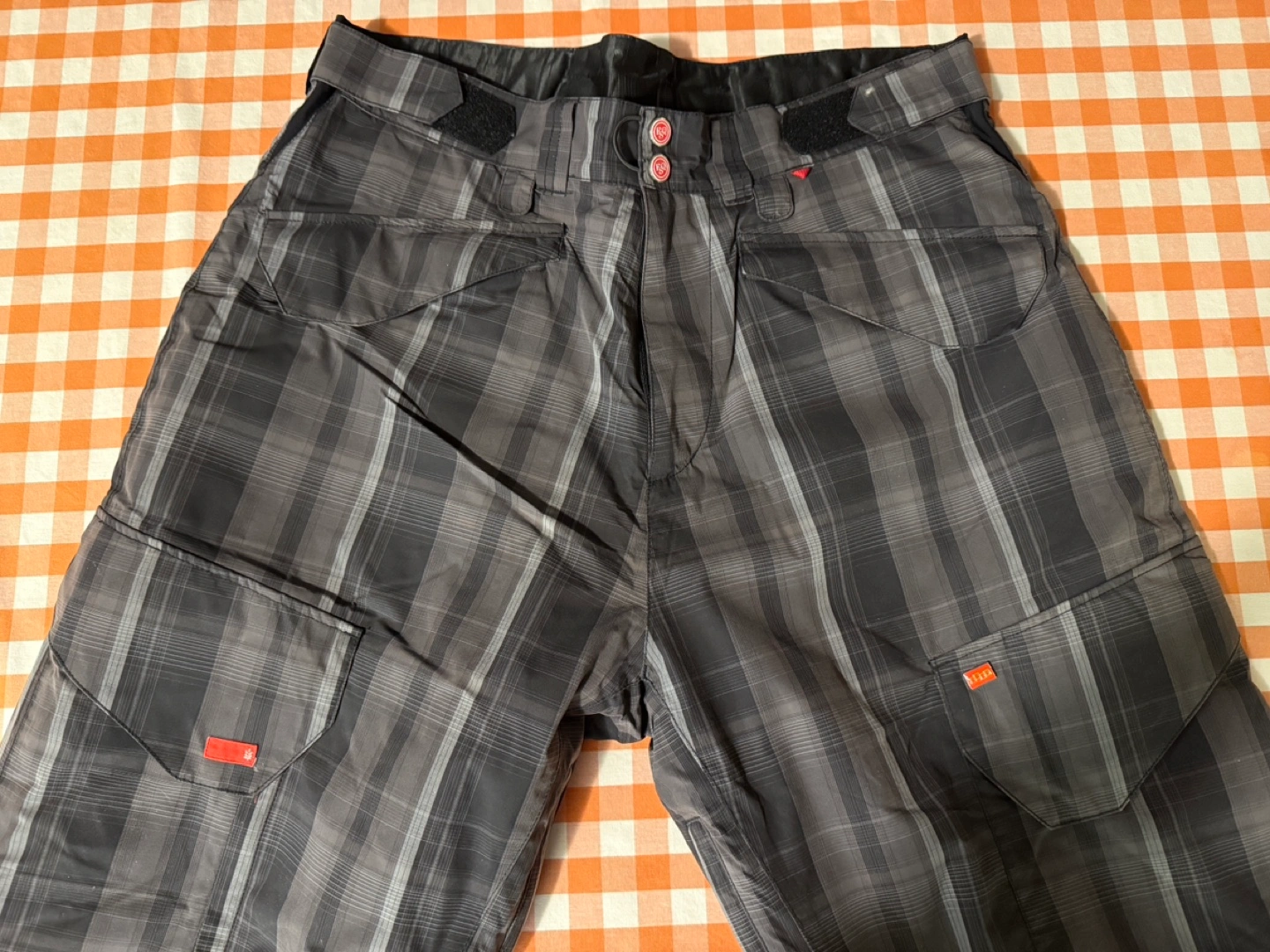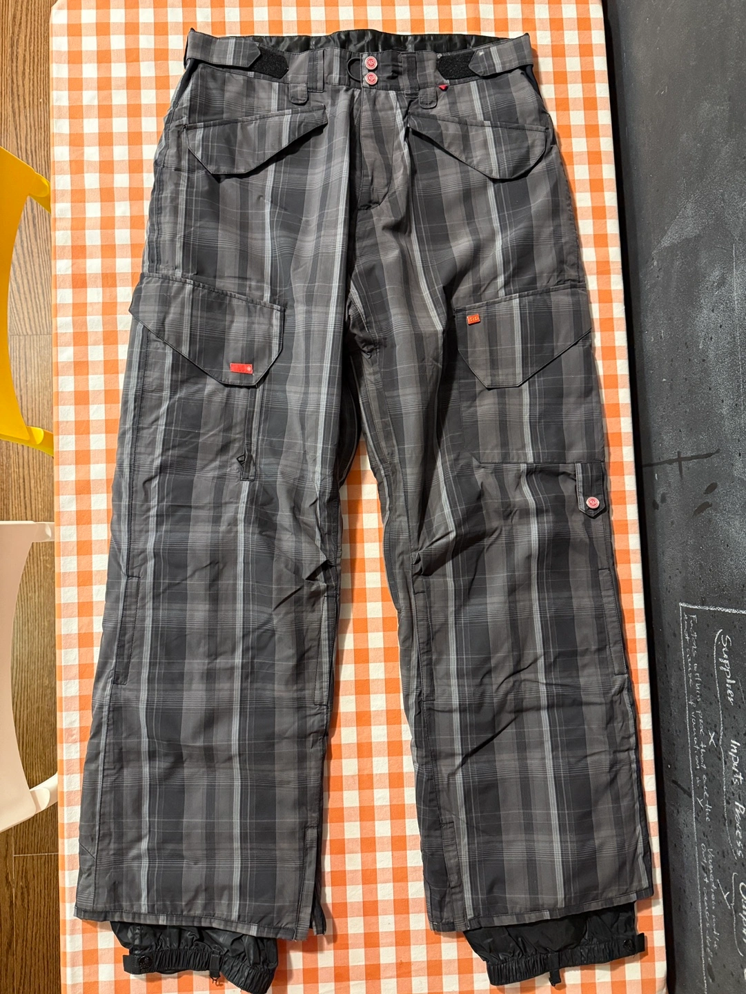 Grey and black plaid snowboard pants with multiple pockets. Has adjustable waist and boot gaiters.