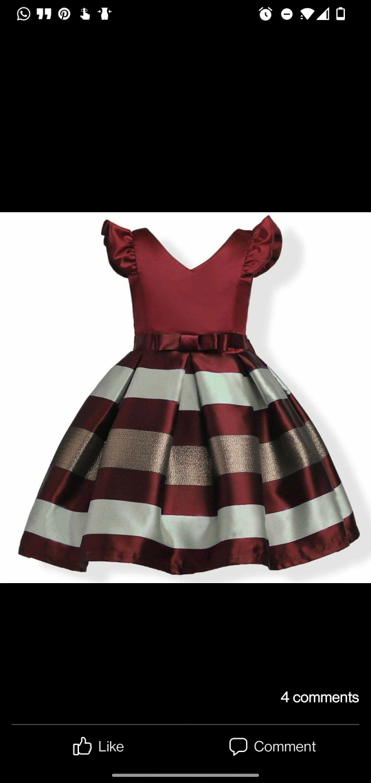 Burgundy dress with short sleeves and a white and gold striped skirt. Has a v-neckline and a sash with a bow at the waist.