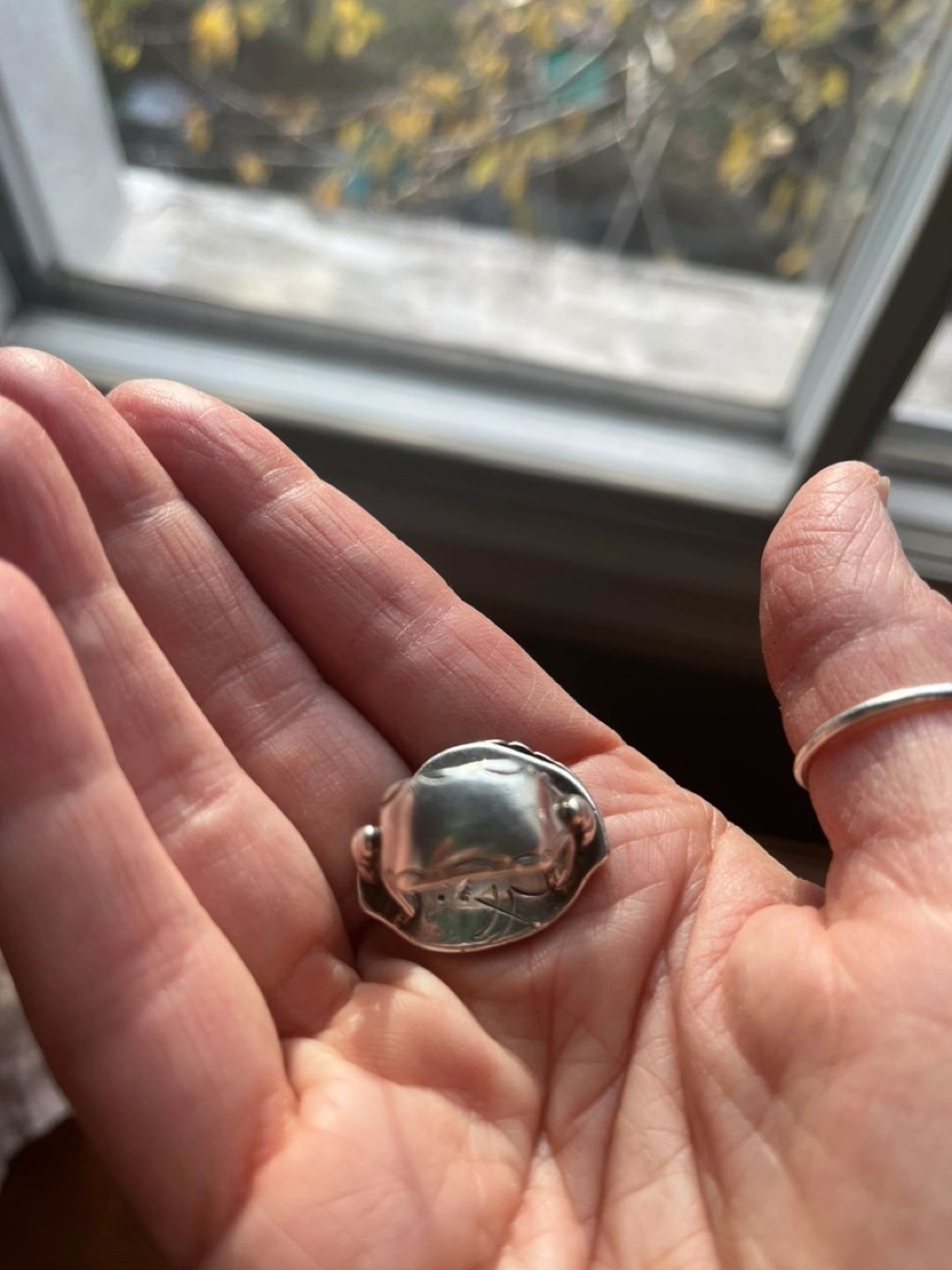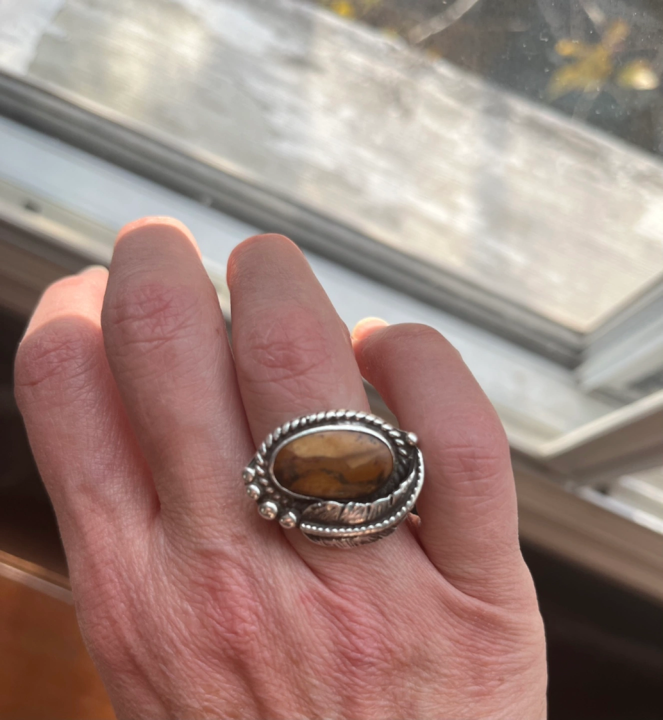 One of a kind, stunning, sterling silver, real tiger's eye stone ring with feather. Intricate detail on the band, $25
