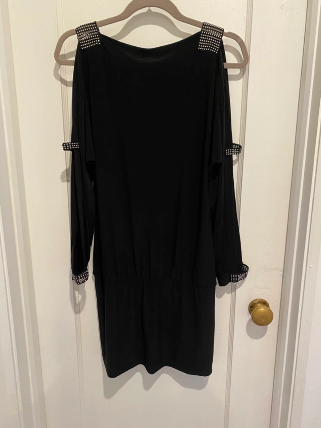 131Long-sleeved black mini dress with cold shoulders and rhinestone detailing. Elastic waistband. Only available for pick up